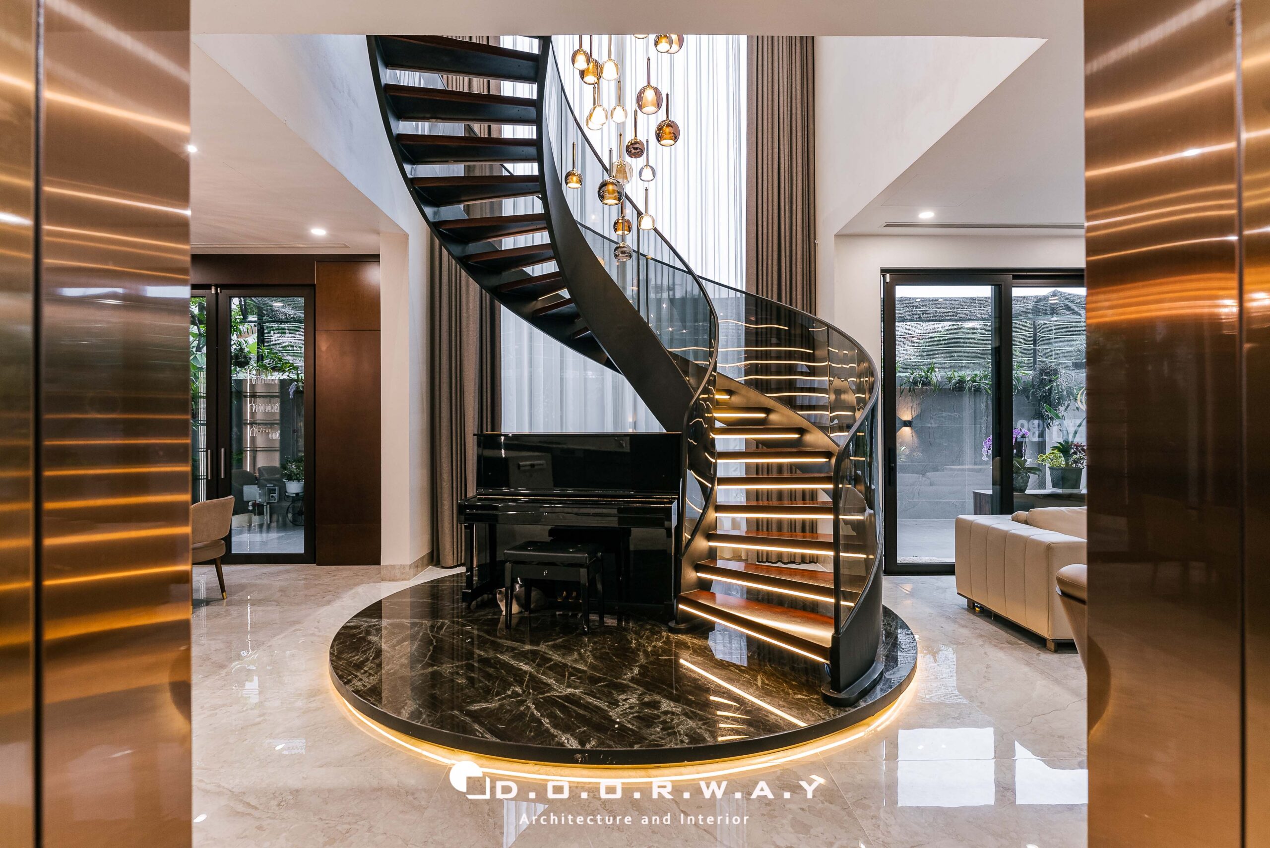 Điểm nhấn đặc biệt không thể bỏ qua của căn biệt thự chính là cầu thang xoắn ốc đặt giữa không gian, nơi kết nối giữa khu vực phòng khách và bếp. Đường cong mềm mại của bậc thang hòa quyện với ánh sáng từ ánh đèn thả trần tinh tế, biến nơi đây như trở thành một tác phẩm nghệ thuật ngay trong ngôi nhà. Cầu thang không chỉ làm nhiệm vụ kết nối không gian, mà còn trở thành biểu tượng của sự chuyển động, gợi nhắc về nhịp sống hiện đại nhưng đầy duyên dáng. Đây chính là chi tiết làm nên sự khác biệt trong thiết kế nội thất biệt thự mà ít công trình nào có được.