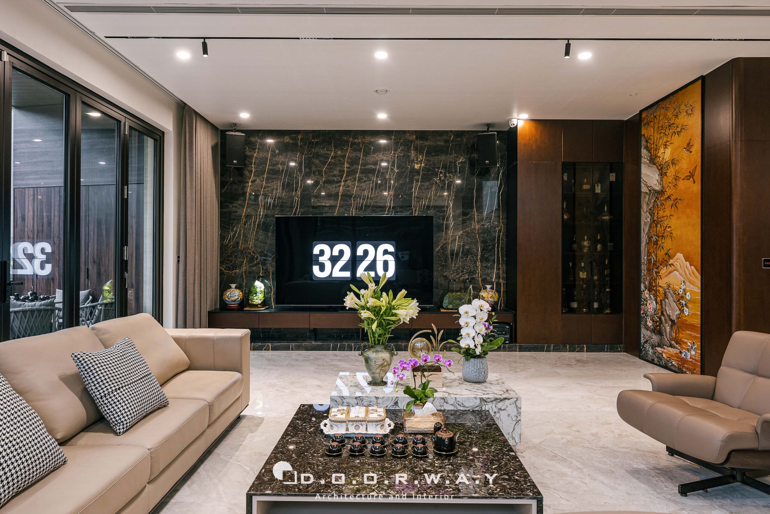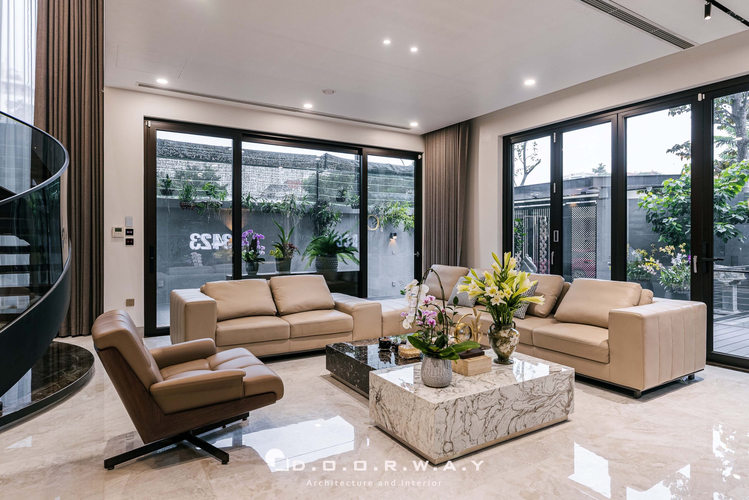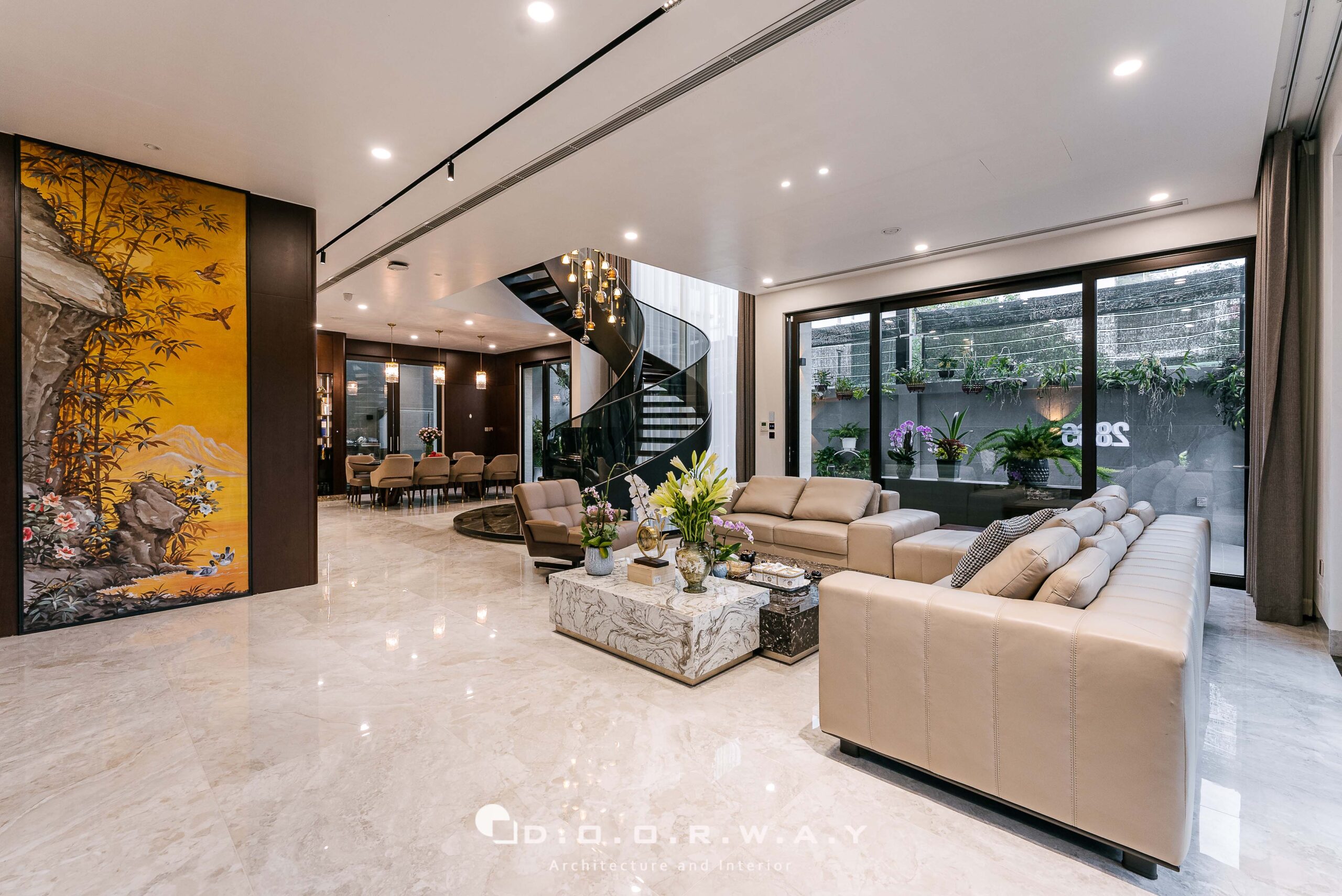 Bước vào không gian phòng khách, ấn tượng đầu tiên chính là sự rộng thoáng và cảm giác xa hoa mà nội thất mang lại. Các kiến trúc sư D.O.O.R.W.A.Y đã khéo léo sử dụng hệ thống cửa kính cường lực kích thước lớn, để ánh sáng tự nhiên chan hòa, lan tỏa khắp không gian. Bộ sofa da cao cấp với sắc be trang nhã kết hợp cùng bàn trà đá hoa cương tinh xảo tạo nên vẻ đẹp sang trọng nhưng không hề phô trương. Từng chi tiết trong phòng khách đều được tính toán kỹ lưỡng, vừa đảm bảo tính thẩm mỹ, vừa giữ được sự tiện nghi cho gia chủ.