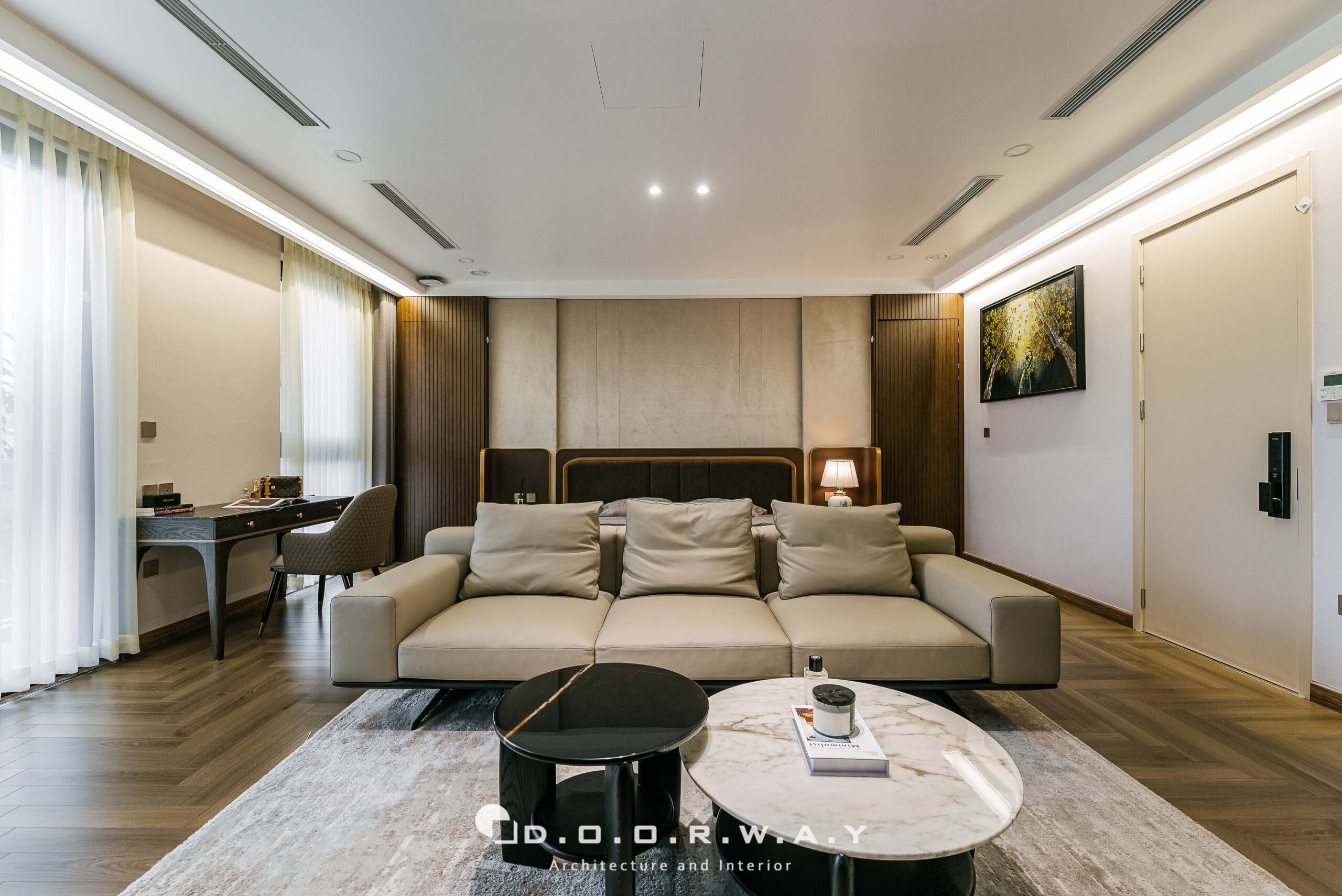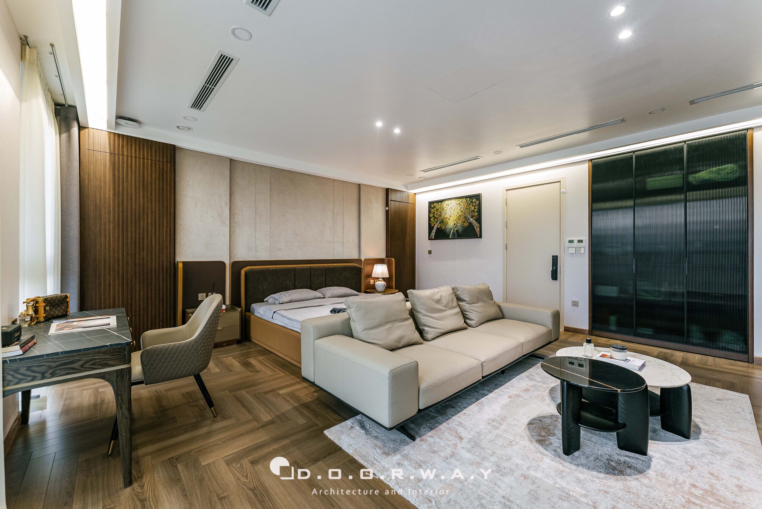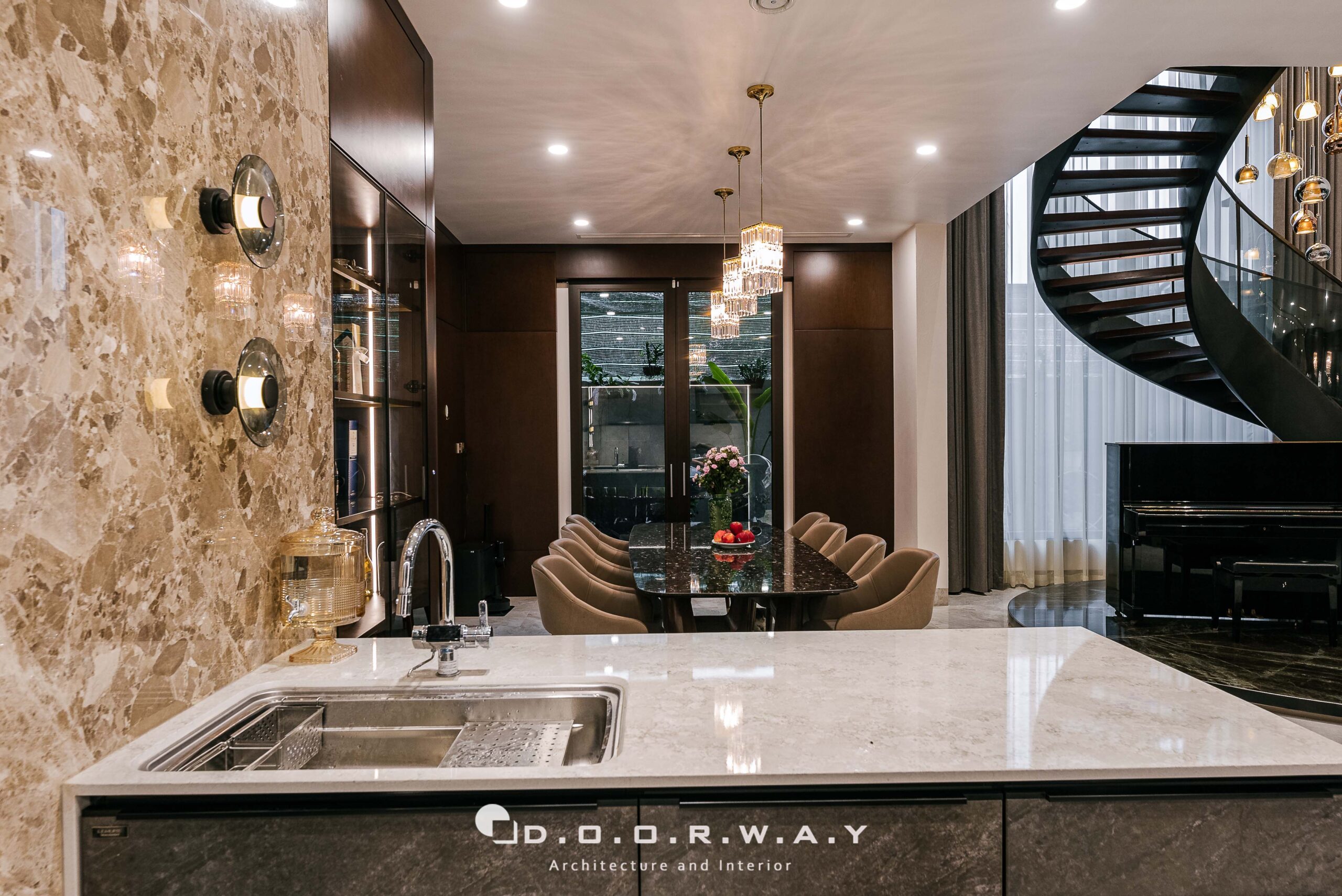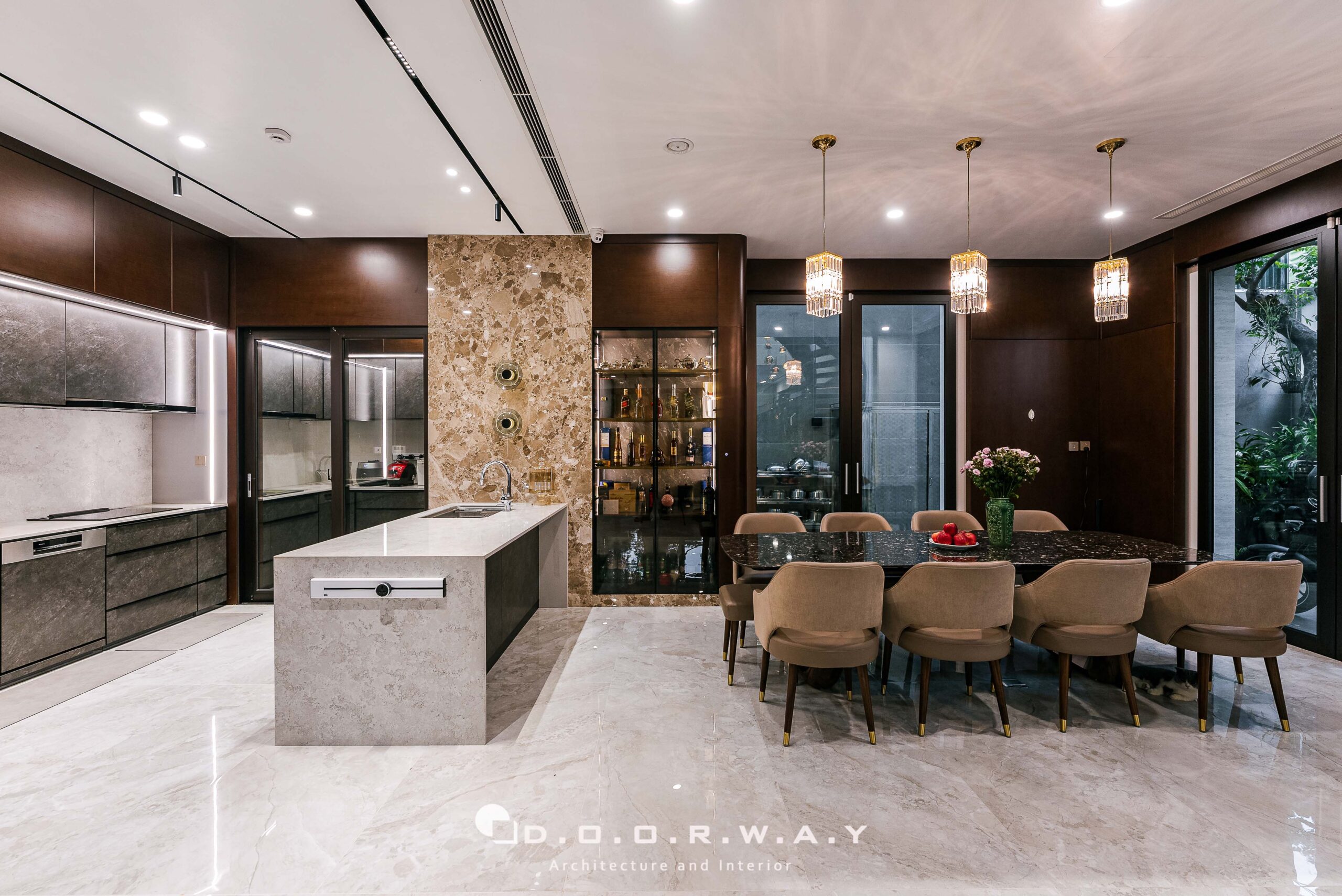 Bước vào không gian phòng khách, ấn tượng đầu tiên chính là sự rộng thoáng và cảm giác xa hoa mà nội thất mang lại. Các kiến trúc sư D.O.O.R.W.A.Y đã khéo léo sử dụng hệ thống cửa kính cường lực kích thước lớn, để ánh sáng tự nhiên chan hòa, lan tỏa khắp không gian. Bộ sofa da cao cấp với sắc be trang nhã kết hợp cùng bàn trà đá hoa cương tinh xảo tạo nên vẻ đẹp sang trọng nhưng không hề phô trương. Từng chi tiết trong phòng khách đều được tính toán kỹ lưỡng, vừa đảm bảo tính thẩm mỹ, vừa giữ được sự tiện nghi cho gia chủ.