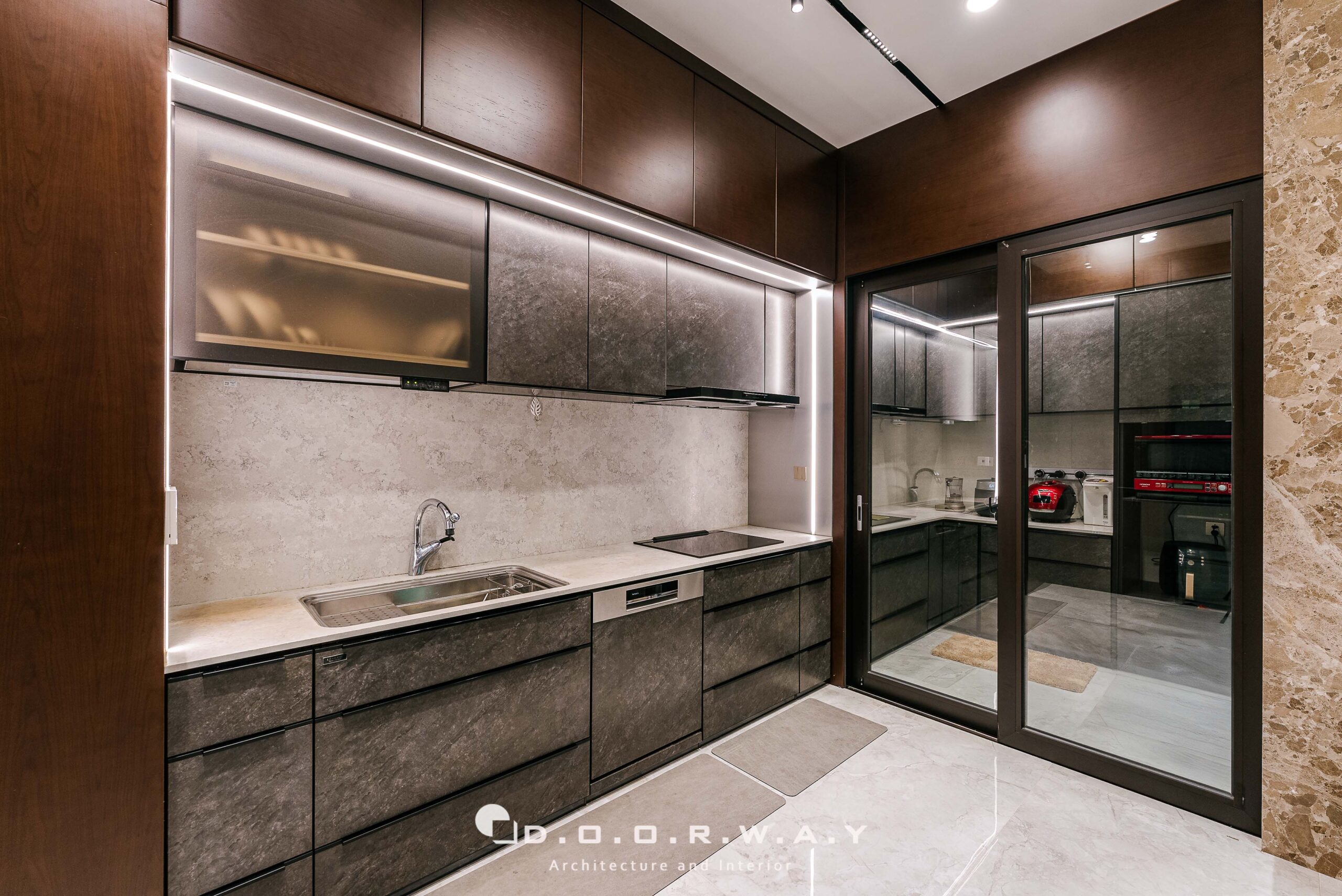 Điểm nhấn tinh tế nằm ở hệ thống đèn LED hắt sáng âm tủ, mang lại cảm giác ấm áp, đồng thời hỗ trợ tối ưu cho việc nấu nướng. Bếp còn được bố trí tách biệt giữa khu bếp ướt và bếp khô bằng vách kính trượt, giúp hạn chế mùi nhưng vẫn đảm bảo sự kết nối liền mạch về mặt không gian. Đây chính là sự kết hợp hoàn hảo giữa công năng và thẩm mỹ trong kiến trúc nội thất hiện đại.