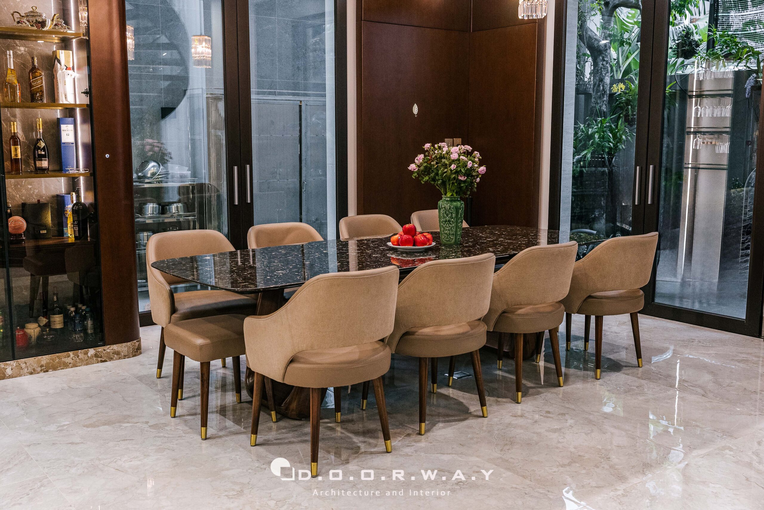 Bước ra khỏi khu bếp là không gian phòng ăn sang trọng, nơi bàn ăn dài mặt đá đen bóng loáng nổi bật giữa nền đá hoa cương cao cấp. Bộ ghế bọc nỉ êm ái với tông màu trung tính tạo cảm giác gần gũi, cân bằng sự sang trọng của chất liệu đá. Phía trên bàn ăn, cụm đèn thả pha lê lung linh trở thành điểm nhấn thị giác, biến mỗi bữa ăn gia đình hay bữa tiệc tiếp khách đều mang phong vị của một không gian fine-dining ngay trong chính căn nhà.