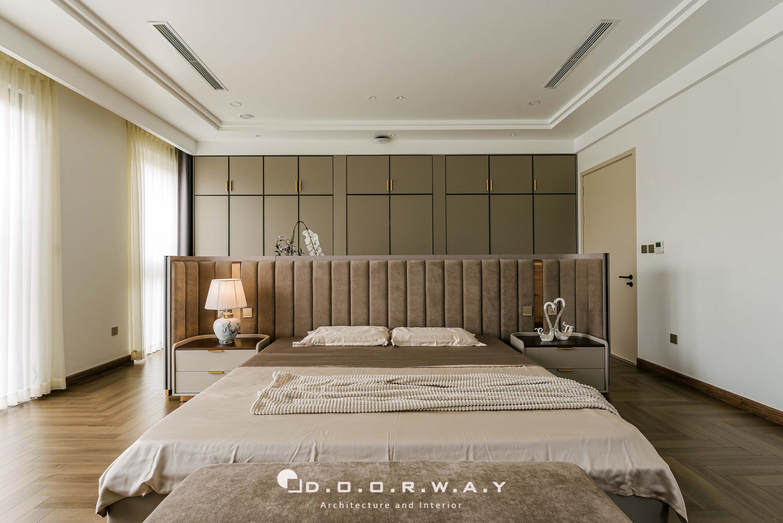 Phòng ngủ master trong thiết kế nội thất biệt thự Gia Lâm là minh chứng rõ nét cho sự sang trọng không phô trương. Với diện tích rộng rãi, cách bố trí tinh tế cùng sự đầu tư kỹ lưỡng vào từng chi tiết, không gian này mang đến trải nghiệm nghỉ ngơi và thư giãn trọn vẹn cho gia chủ. Phòng ngủ được thiết kế theo phong cách hiện đại tối giản với gam màu be chủ đạo. Giường ngủ lớn cùng phần tựa bọc nệm cao cấp tạo điểm nhấn, vừa sang trọng vừa mang lại sự thoải mái. Cửa sổ kính toàn cảnh với rèm hai lớp giúp căn phòng luôn tràn ngập ánh sáng tự nhiên nhưng vẫn đảm bảo sự riêng tư khi cần.