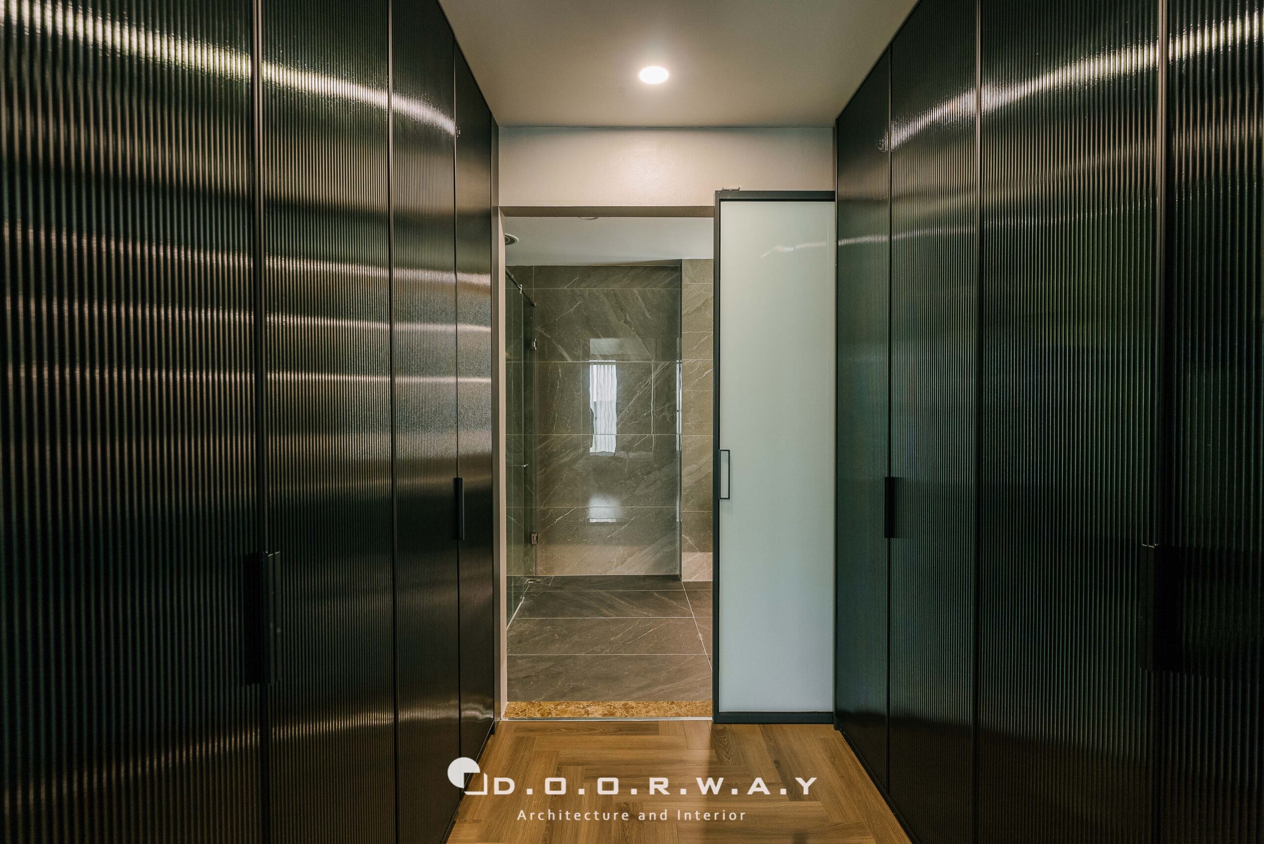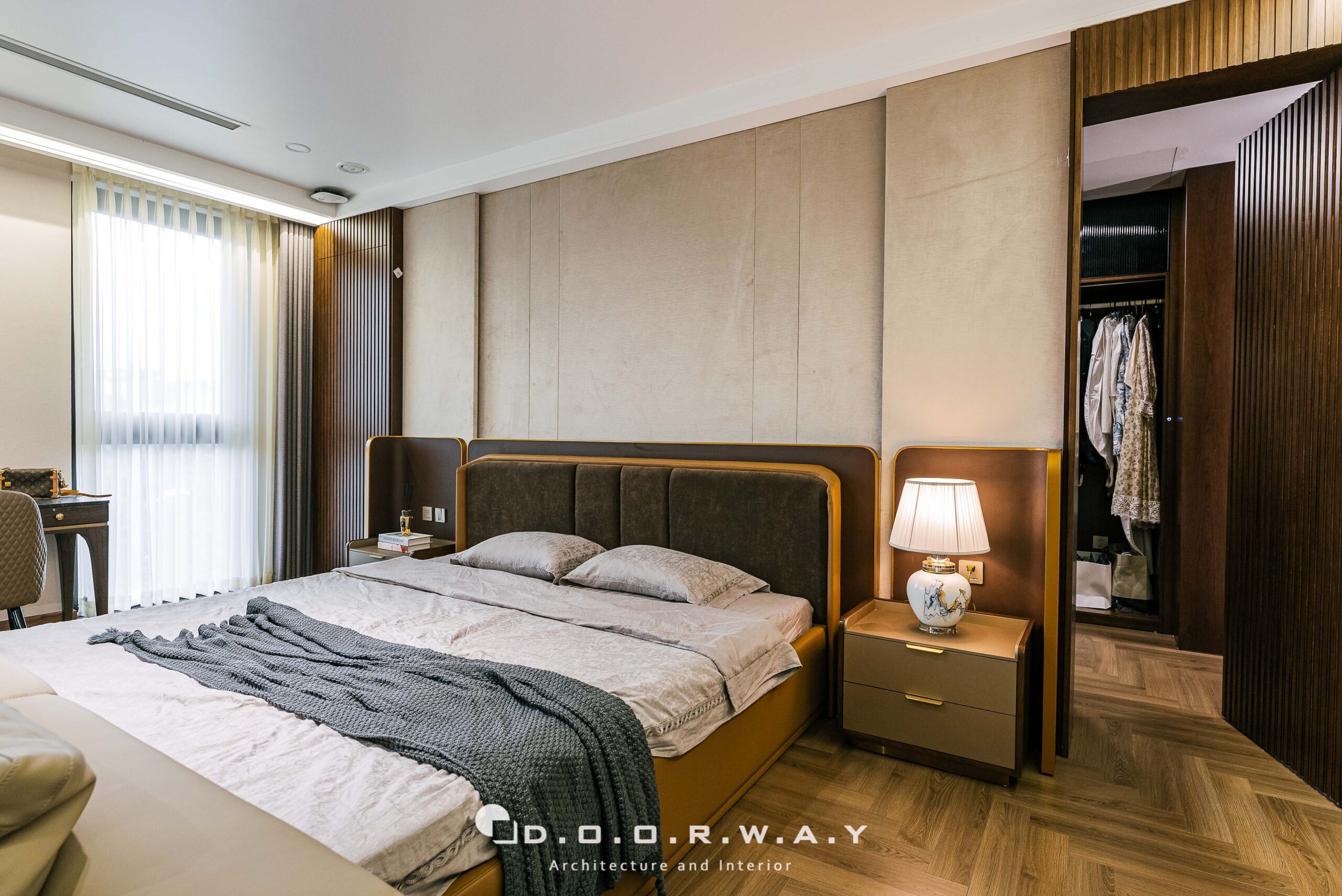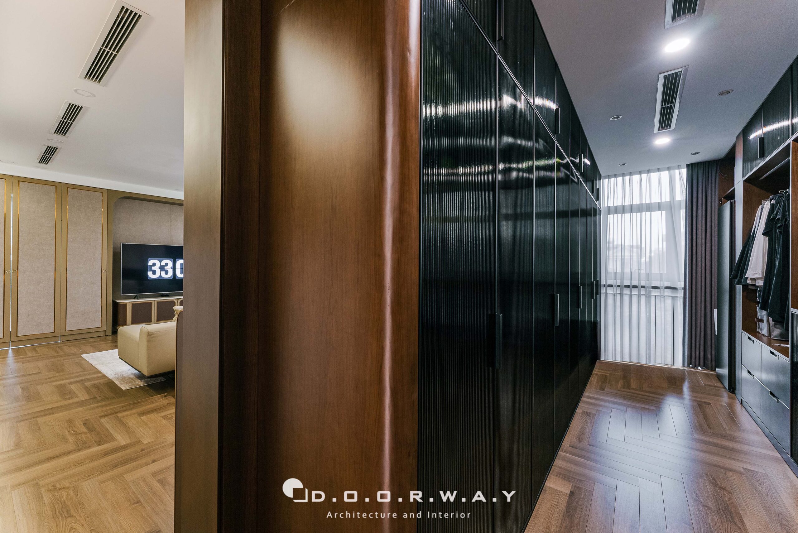 Đước ngăn cách với không gian chính của phòng ngủ và khu thay đồ, các kts D.O.O.R.W.A.Y đã tinh tế sử dụng hệ cửa dấu khuôn, để không làm ảnh hưởng đến tổng thể rộng rãi của căn phòng. phòng. Không gian phòng thay đồ không quá rộng nhưng vẫn đảm bảo sự sang trọng và tiện nghi với hệ tủ kịch trần cánh kính màu tối tạo chiều sâu huyền bí, những đường vân và ánh phản chiếu khiến từng bộ trang phục.