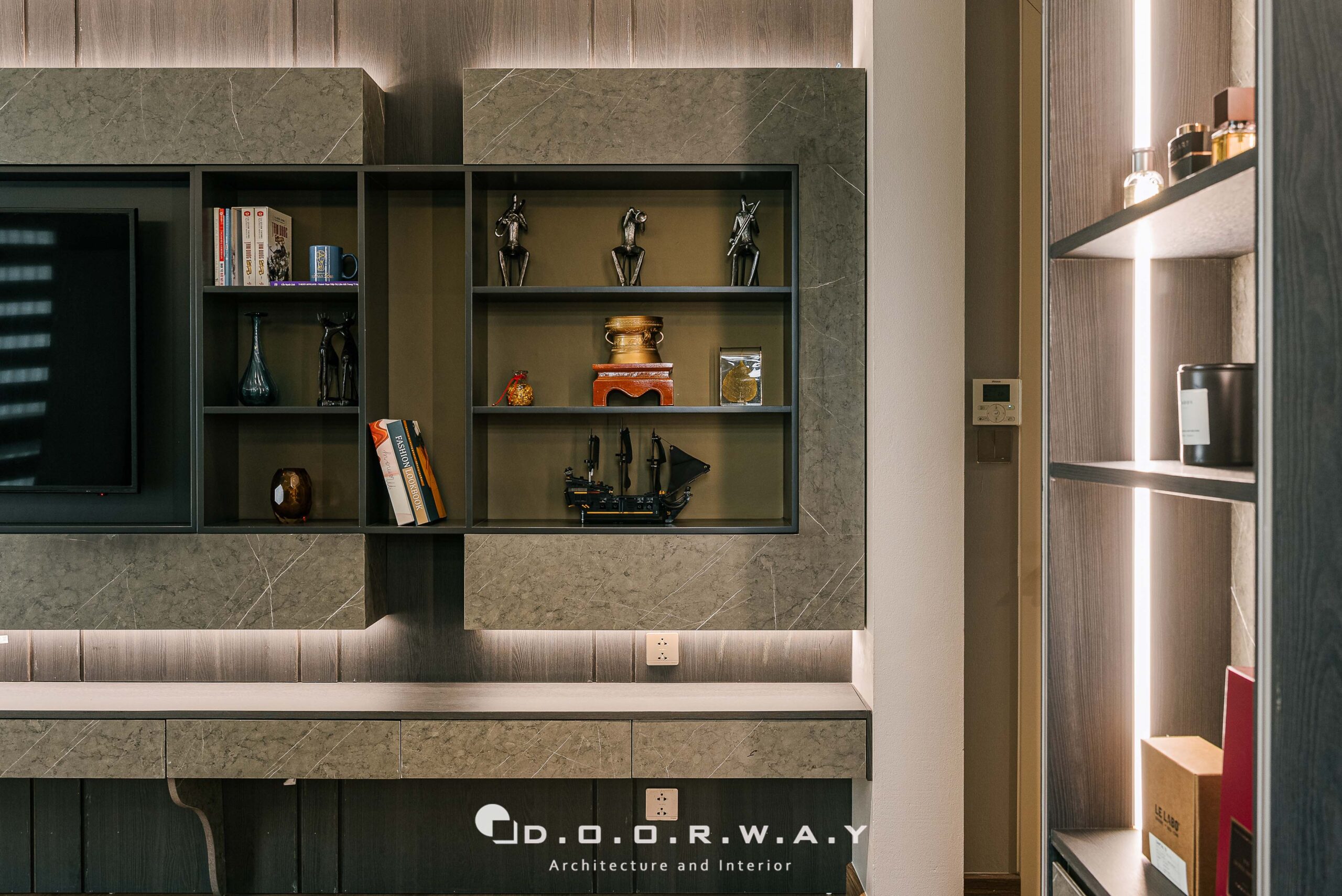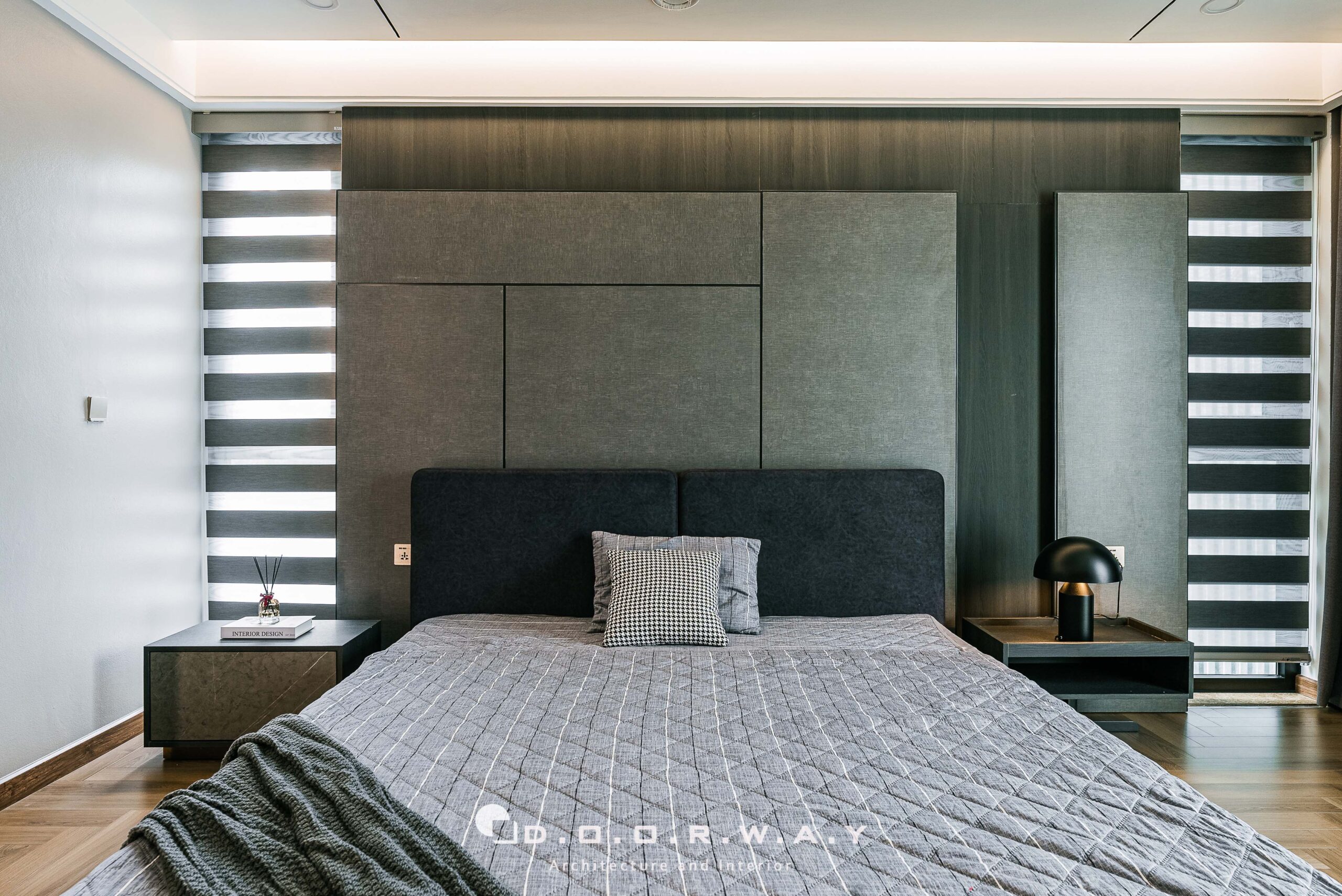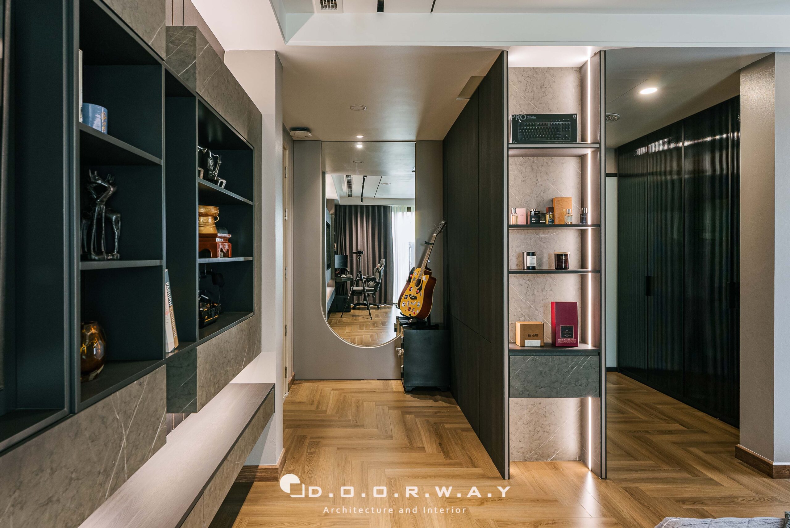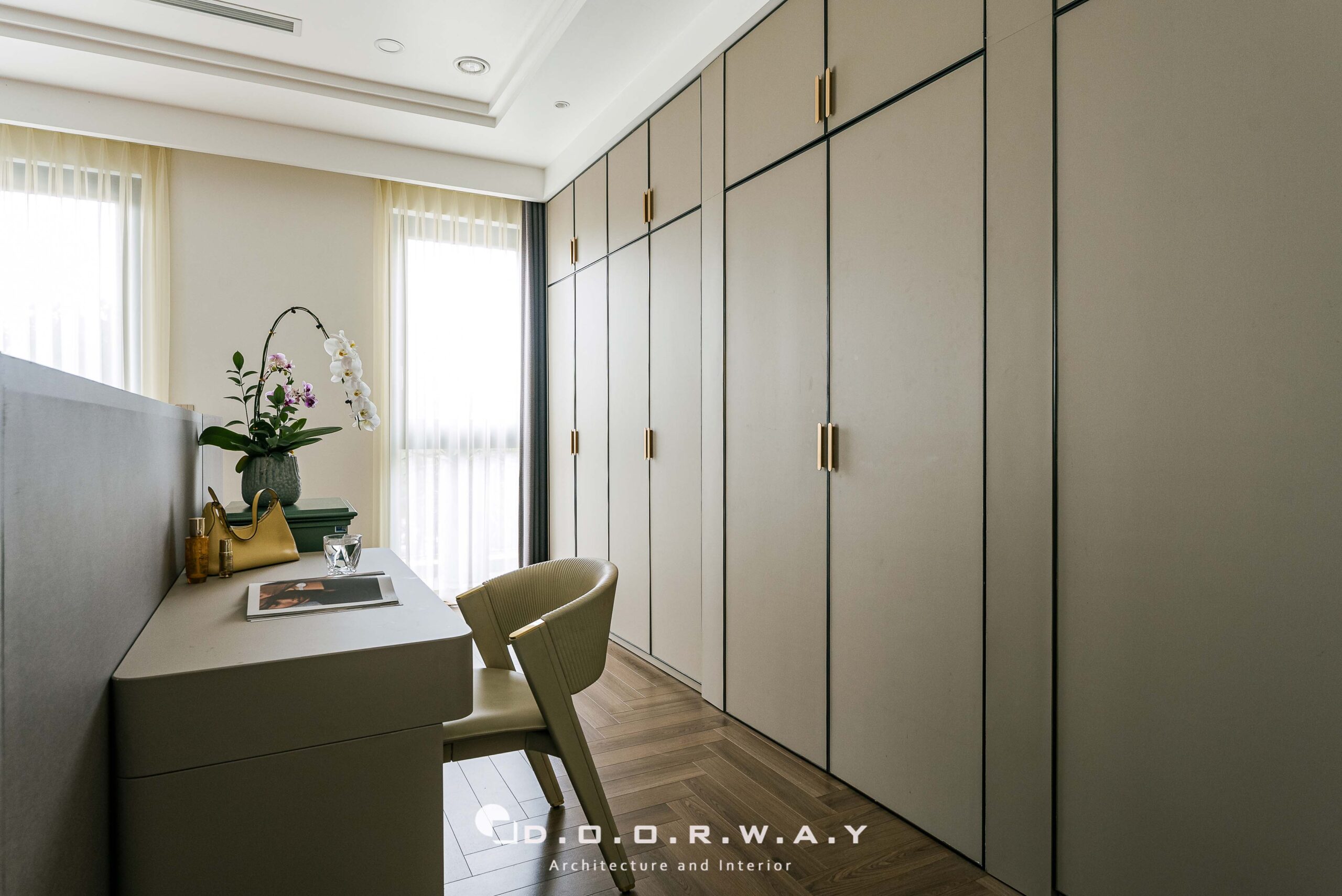 Đước ngăn cách với không gian chính của phòng ngủ và khu thay đồ, các kts D.O.O.R.W.A.Y đã tinh tế sử dụng hệ cửa dấu khuôn, để không làm ảnh hưởng đến tổng thể rộng rãi của căn phòng. phòng. Không gian phòng thay đồ không quá rộng nhưng vẫn đảm bảo sự sang trọng và tiện nghi với hệ tủ kịch trần cánh kính màu tối tạo chiều sâu huyền bí, những đường vân và ánh phản chiếu khiến từng bộ trang phục.