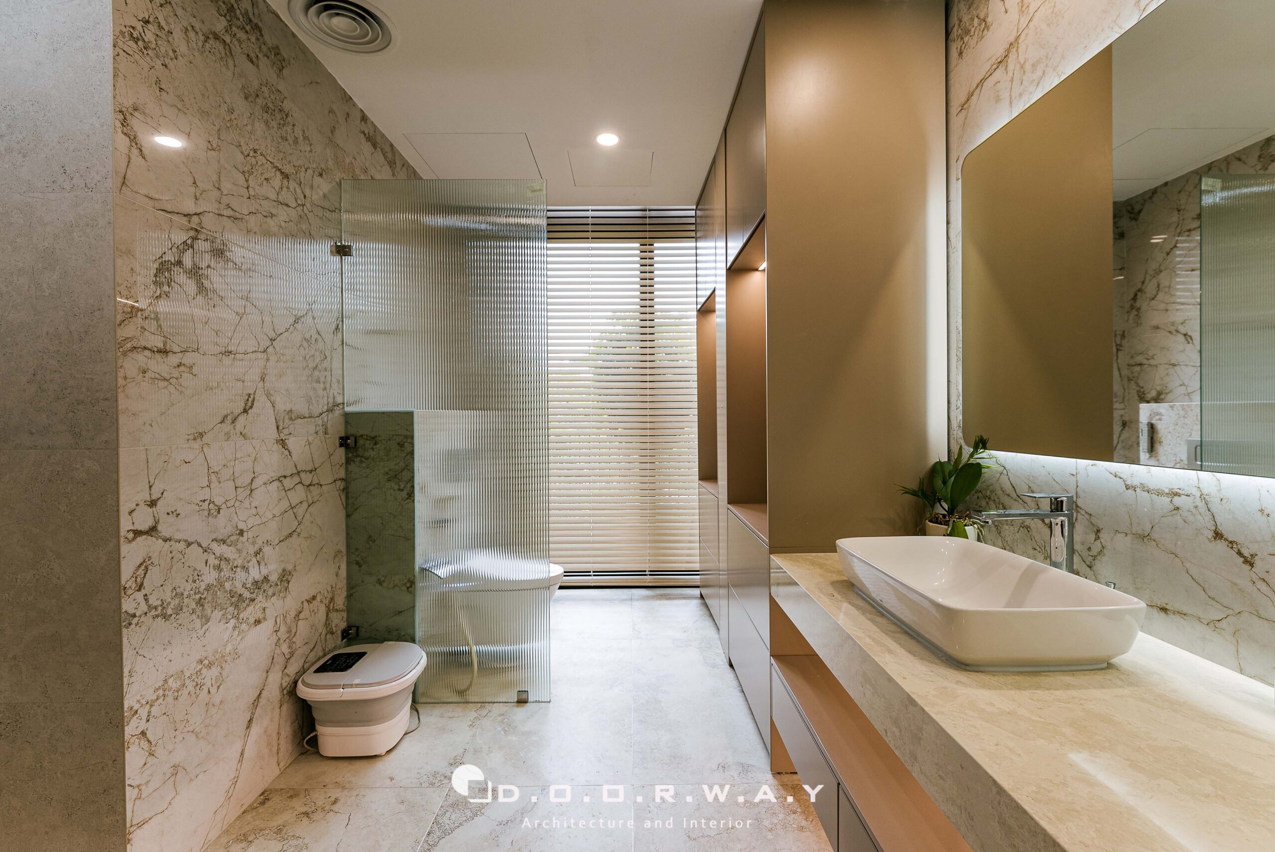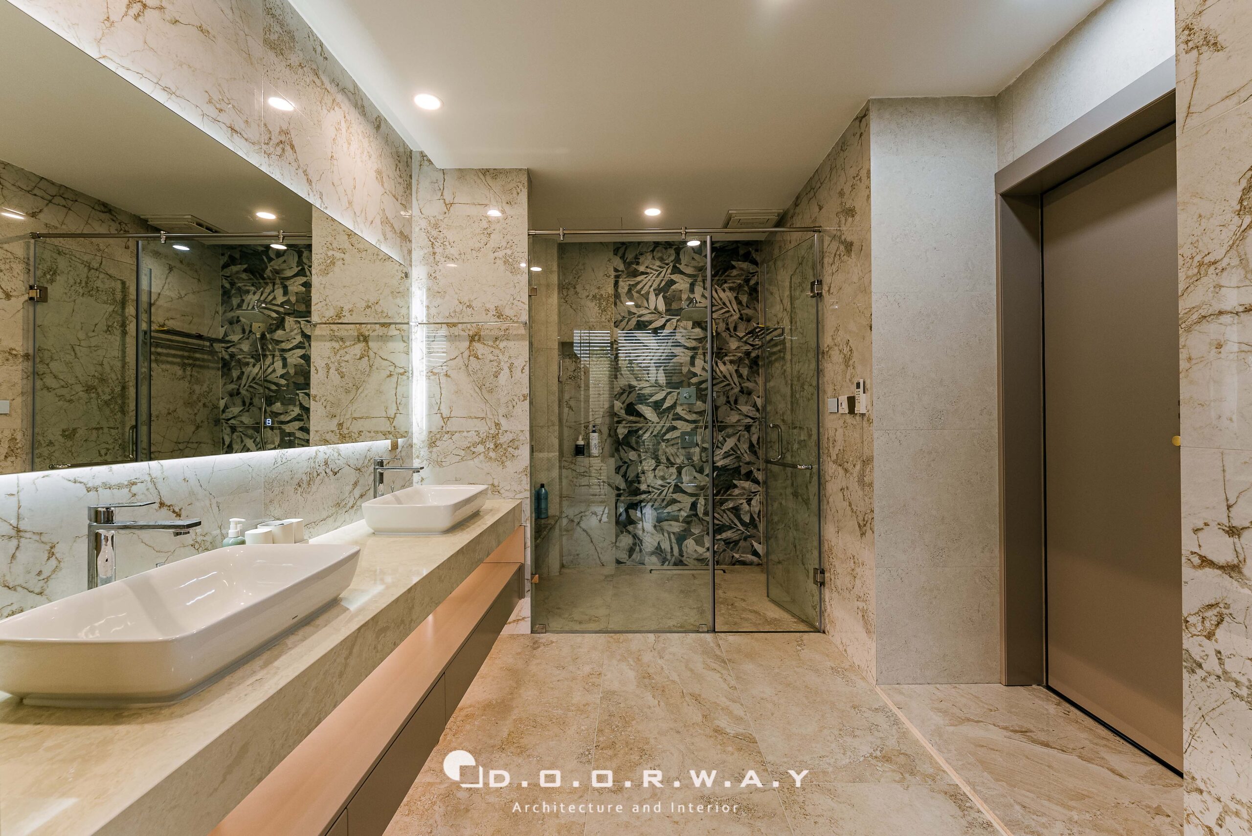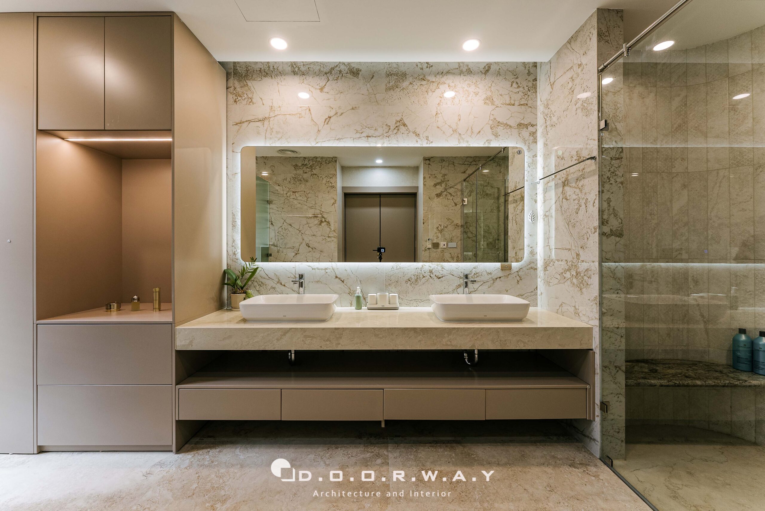 Điểm đến cuối cùng của hành trình trải nghiệm là phòng tắm khép kín, nơi đá marble sáng bóng kết hợp cùng gương lớn và ánh sáng hắt sau tinh tế, tạo nên một khung cảnh xa hoa, lộng lẫy. Lavabo đôi, chi tiết ánh kim sang trọng và khung vòm mềm mại khéo léo biến nơi chốn sinh hoạt thường nhật thành không gian thư giãn đậm chất nghỉ dưỡng.