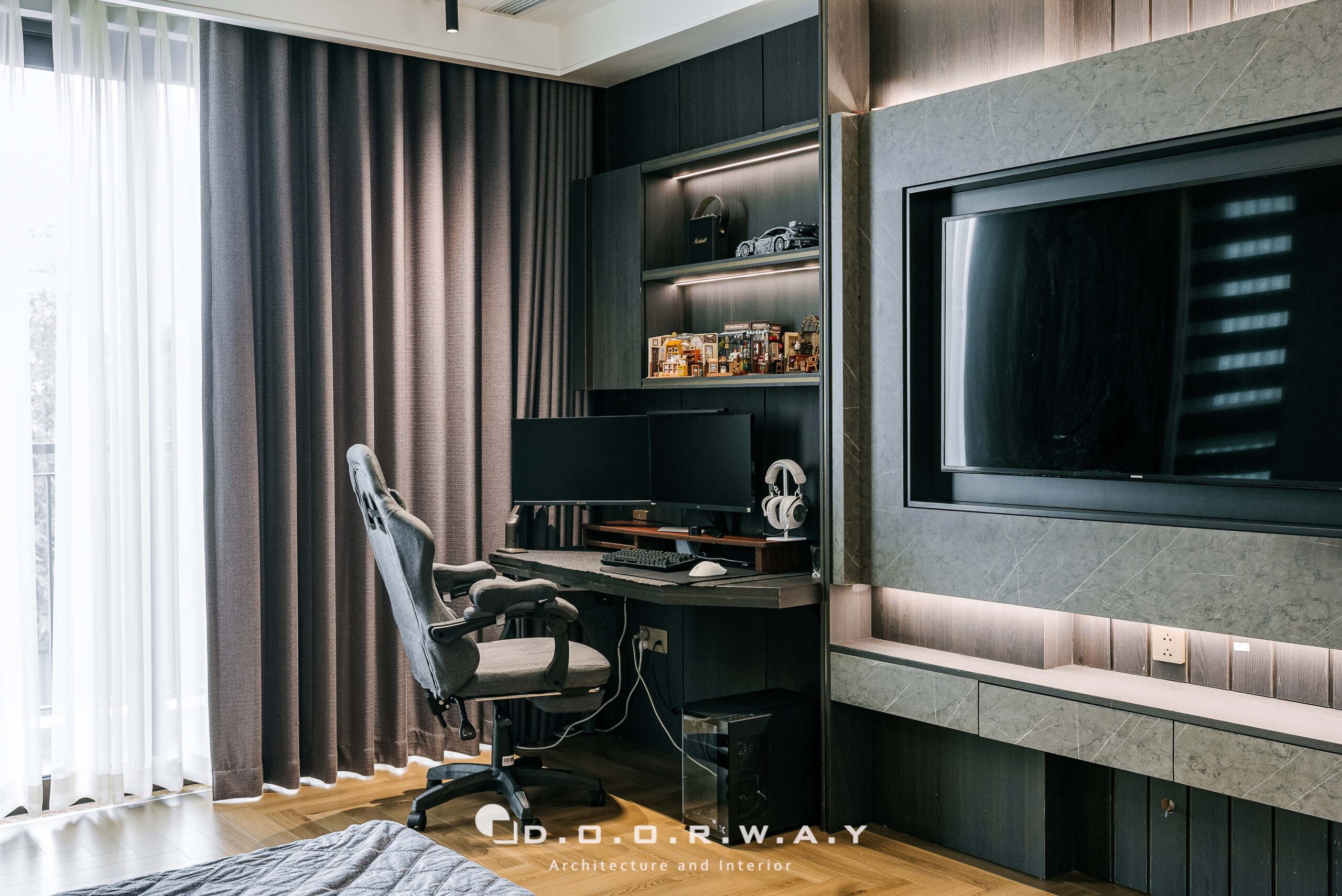 Chiếc giường ngủ gọn gàng đặt ở vị trí trung tâm, phần đầu giường được ốp nỉ, bên trên là bức vách ốp gỗ giả vải chia mảng nhấn nhá, vừa làm điểm tựa vững chắc vừa mang lại sự thoải mái khi nghỉ ngơi. Đối diện giường ngủ là kệ tivi và bàn làm việc hiện đại, thiết kế âm tường thông minh, vừa tiết kiệm diện tích vừa tạo nên tổng thể gọn gàng, sang trọng. Ghế gaming hiện đại, hệ thống máy tính kép cùng tủ trưng bày với đèn led tạo điểm nhấn trẻ trung, thể hiện gu thẩm mỹ tinh tế của chủ nhân căn phòng.Ở mảng tường đối diện giường, vách tivi được xử lý tinh tế, xen kẽ những đợt kệ lớn gắn tường, Mặt bàn rộng, gọn, đủ để cậu con trai vừa học tập vừa làm việc thoải mái. Không gian này còn trở thành nơi để bày trí những món đồ nhỏ, thể hiện sở thích và phong cách cá nhân