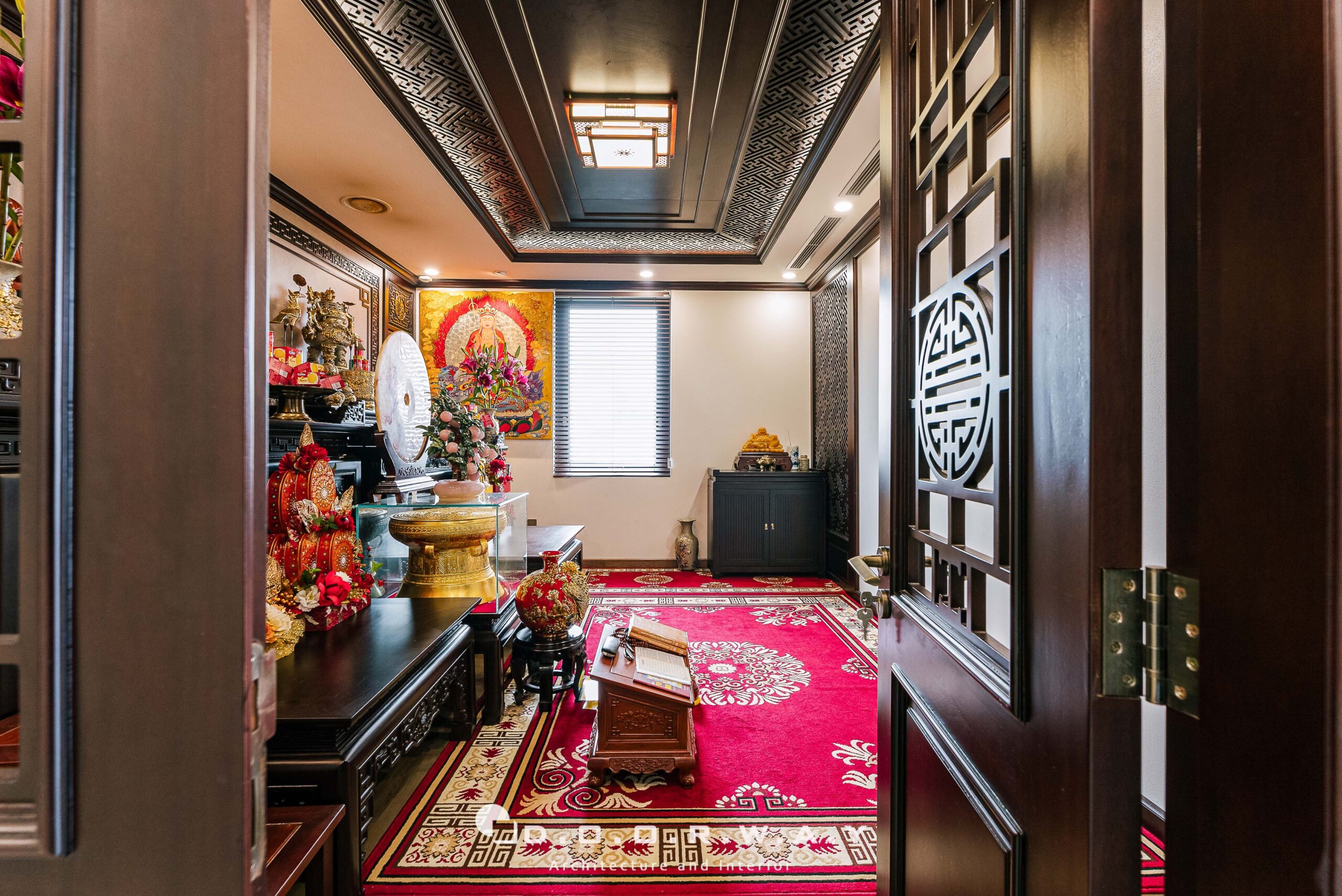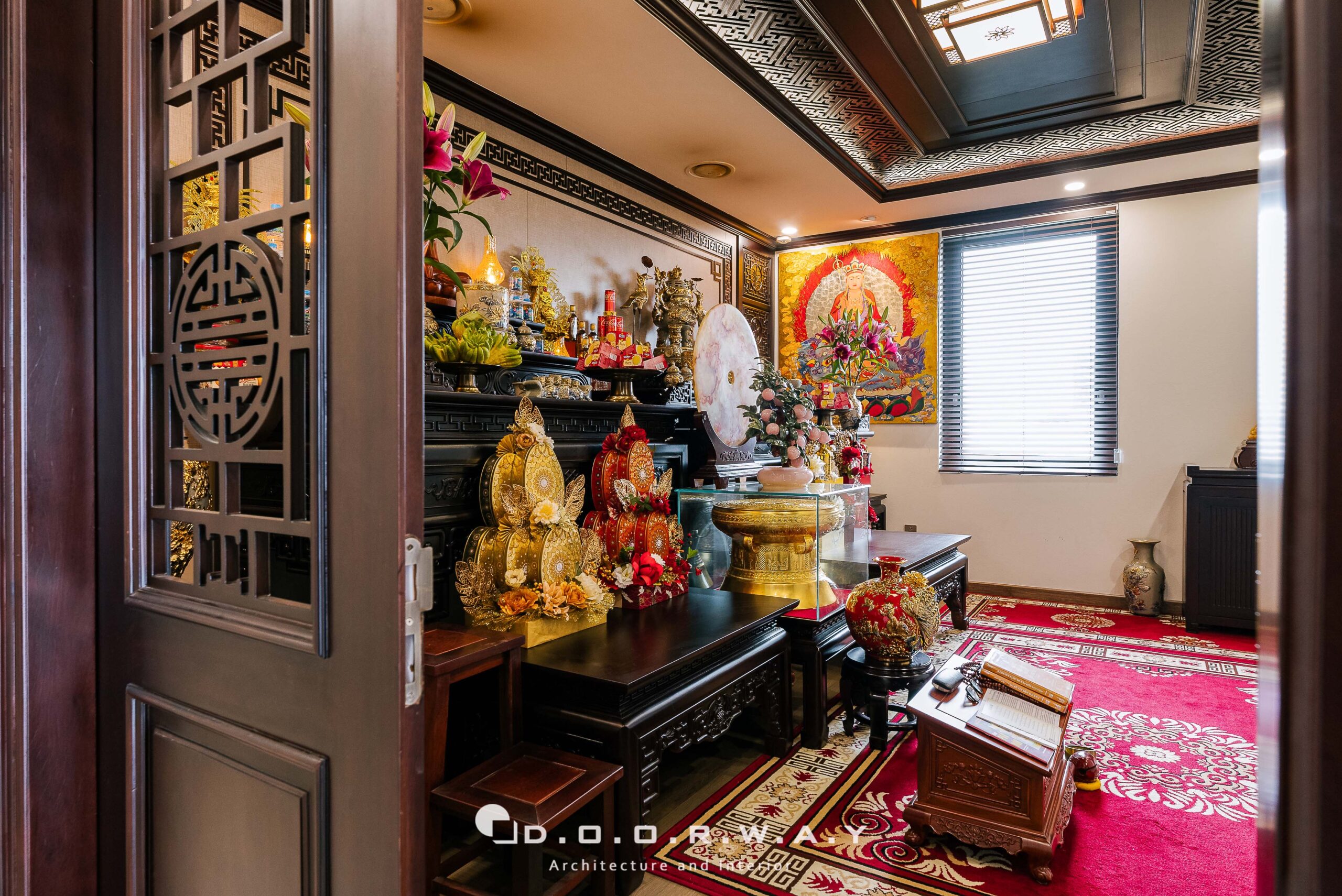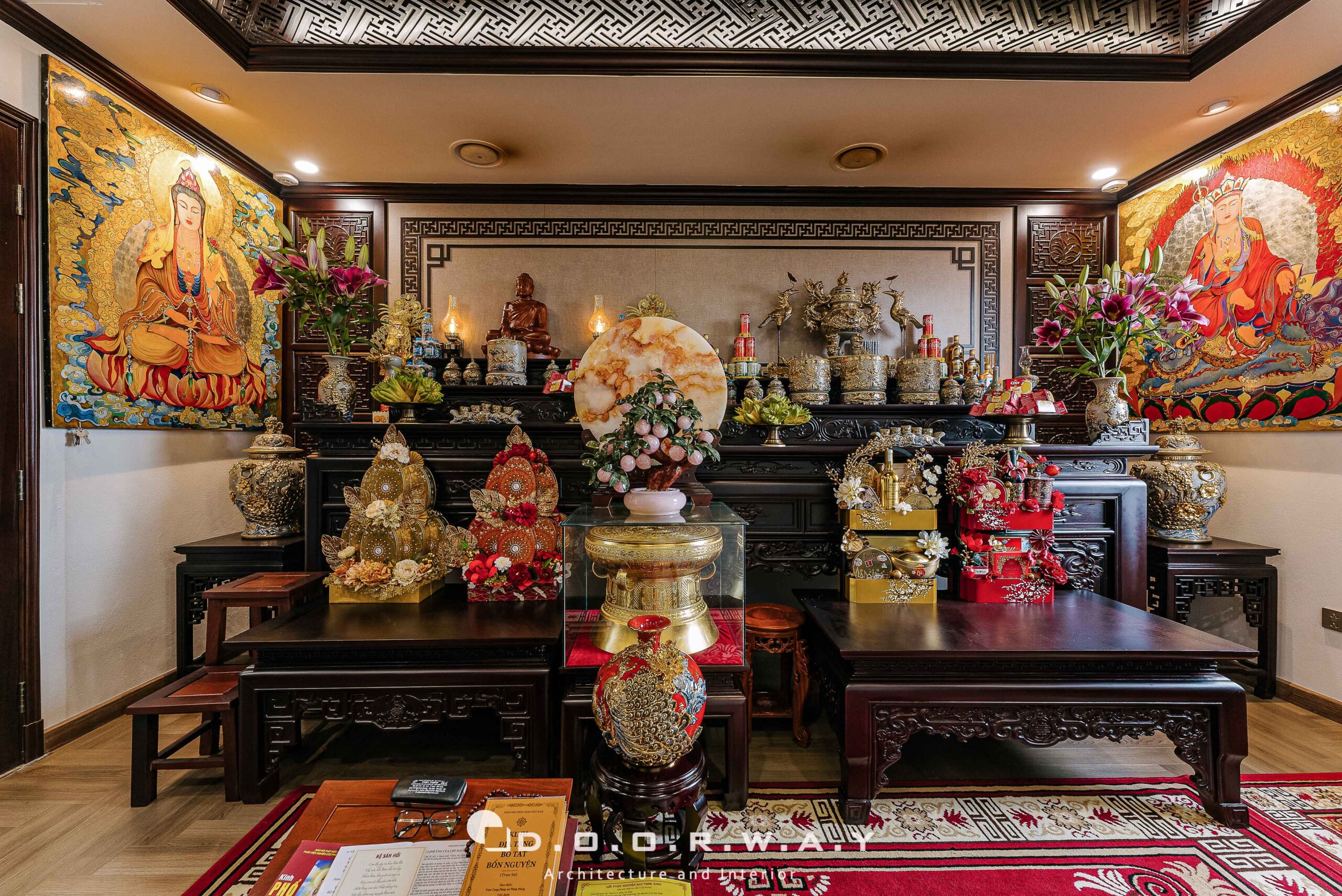 Trong thiết kế nội thất biệt thự, phòng thờ luôn là một không gian quan trọng, thể hiện đời sống tâm linh và truyền thống văn hóa của gia đình Việt. Tại biệt thự Gia Lâm, không gian thờ cúng được chăm chút tỉ mỉ, vừa sang trọng, hiện đại nhưng vẫn giữ được sự trang nghiêm, phù hợp với phong thủy. Nổi bật trong không gian là hệ thống bàn thờ gỗ tự nhiên, chạm khắc tinh tế. Các chi tiết như lư hương, lọ hoa, mâm bồng đều được lựa chọn kỹ lưỡng, phù hợp với tổng thể nội thất biệt thự cao cấp, tạo cảm giác uy nghiêm và trang trọng.