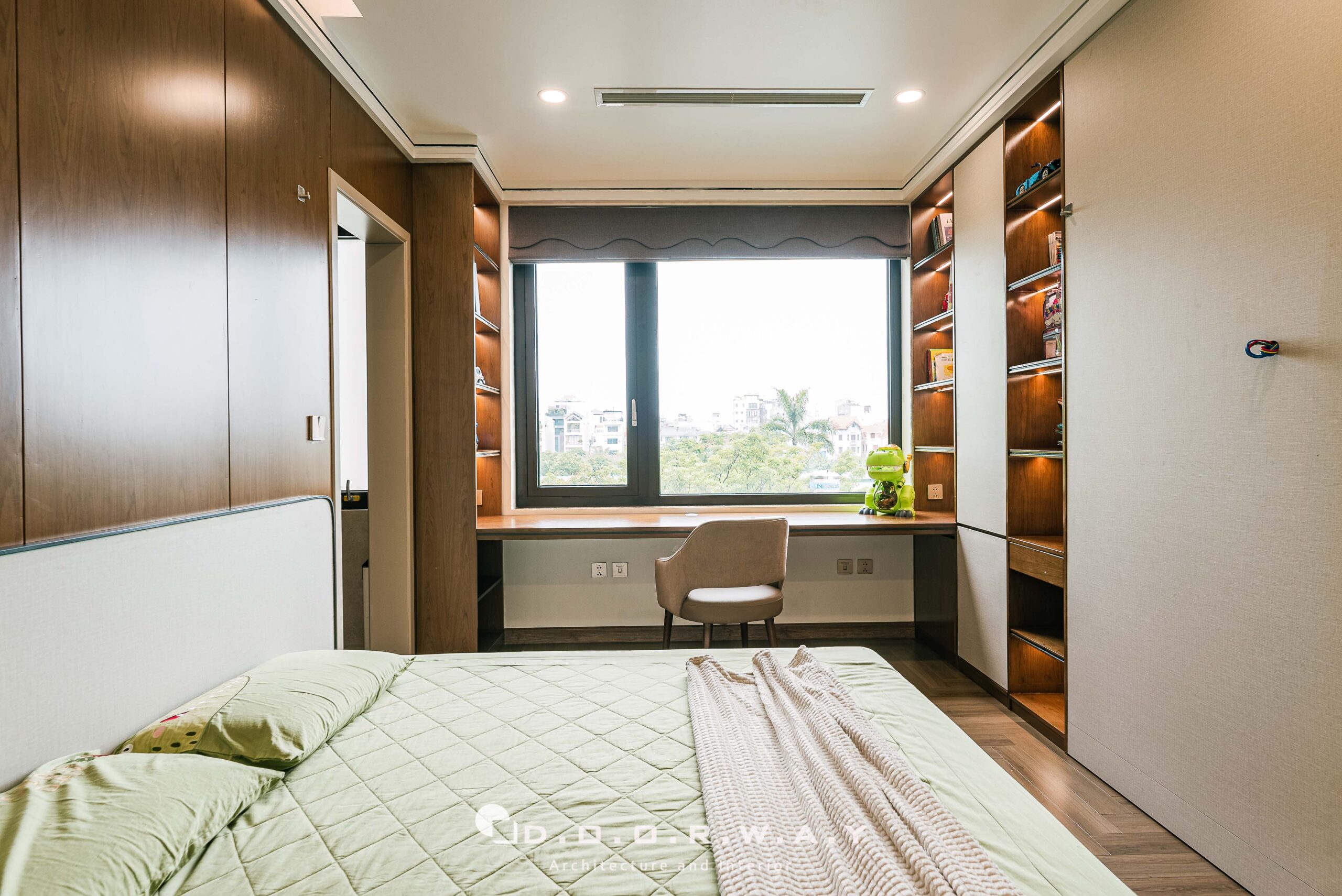 Phòng ngủ còn được chăm chút bởi góc làm việc nhỏ cạnh cửa sổ. Bàn gỗ thanh thoát kết hợp ghế bọc nệm, đặt ngay bên khung cửa tràn ánh sáng tự nhiên, đem đến cảm hứng sáng tạo và sự tiện nghi cho gia chủ. Ánh sáng mềm mại từ lớp rèm voan vừa đảm bảo sự riêng tư, vừa giữ cho căn phòng luôn thoáng đãng.