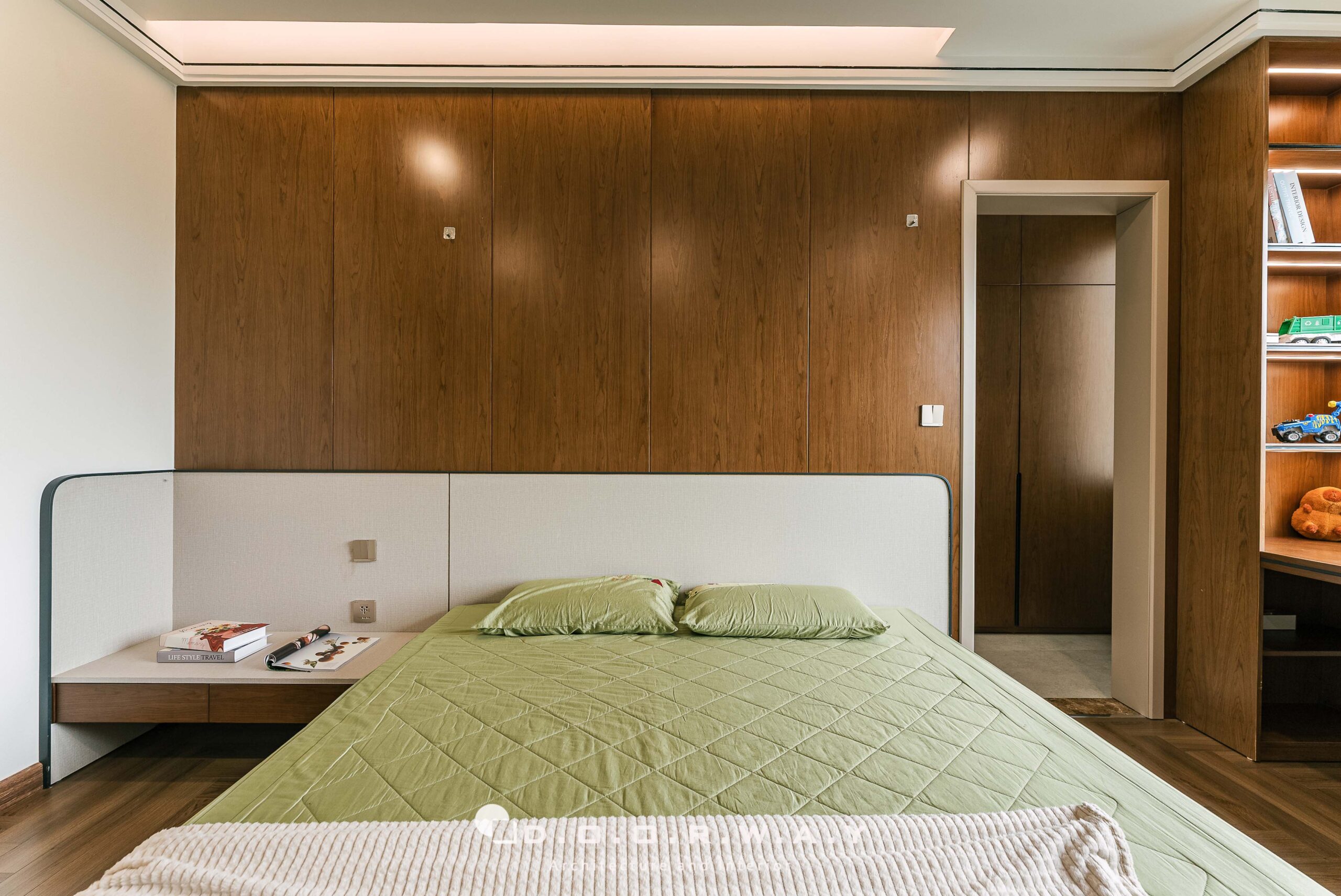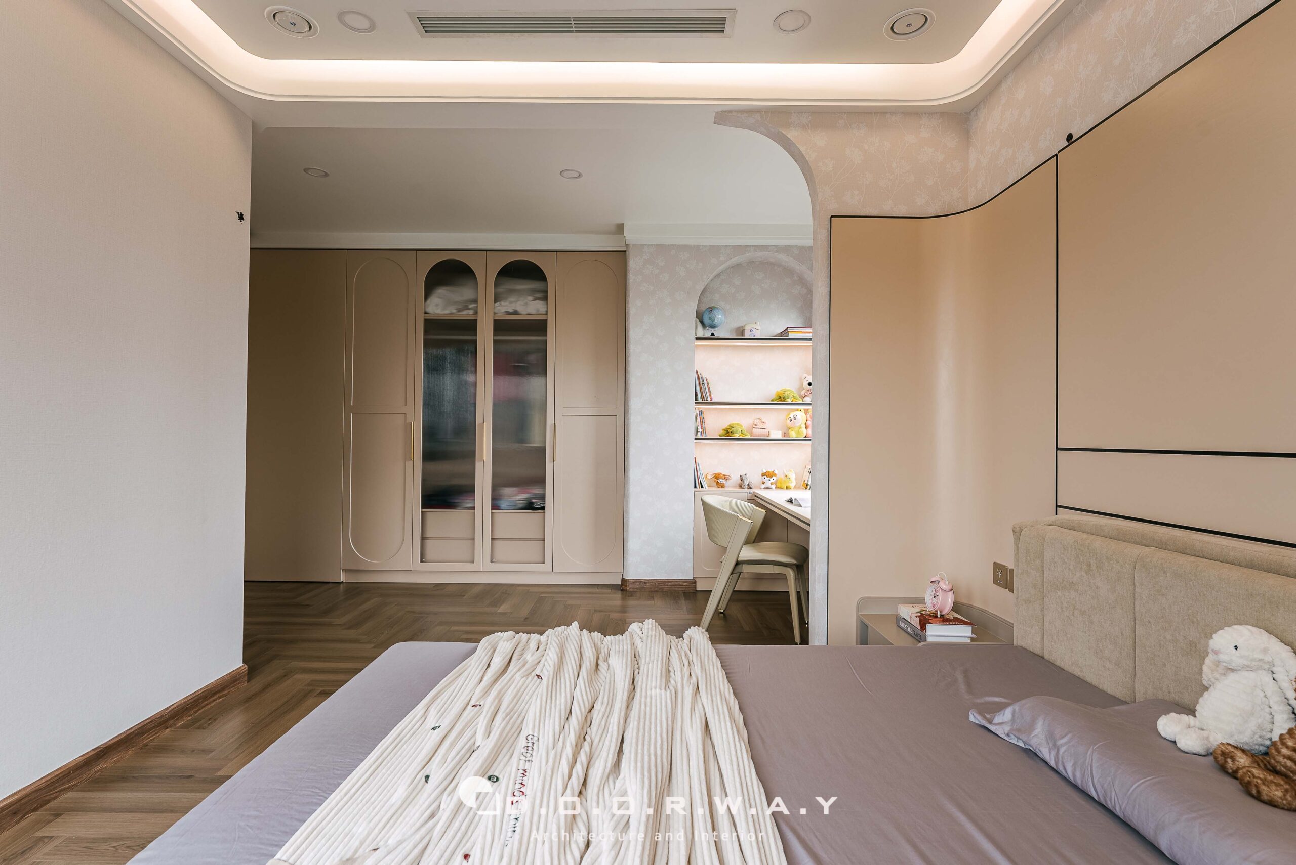 Giường ngủ được đặt ở trung tâm căn phòng, đầu giường bọc nỉ êm ái kết hợp mảng ốp tường hiện đại, tạo điểm tựa vững chắc. Hai bên là tủ đầu giường nhỏ gọn, thuận tiện để bé có thể sắp xếp sách, đèn ngủ và những món đồ yêu thích. Đối diện giường ngủ là hệ tủ quần áo kết hợp cánh kính và gỗ, thiết kế dáng vòm uyển chuyển. Chi tiết này không chỉ mang đến sự sang trọng, hiện đại mà còn tạo sự mềm mại, phù hợp với tinh thần nhẹ nhàng của tổng thể căn phòng.