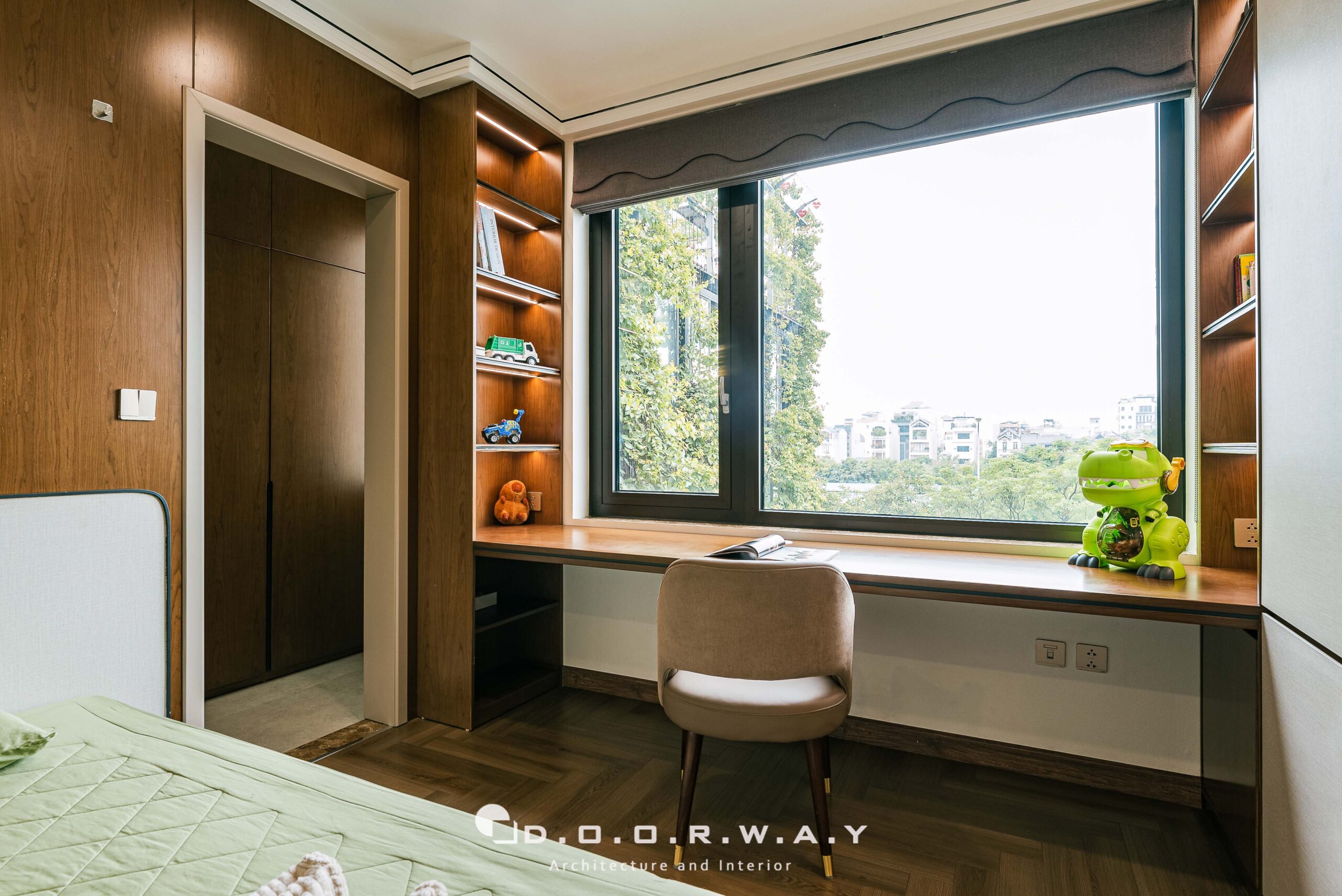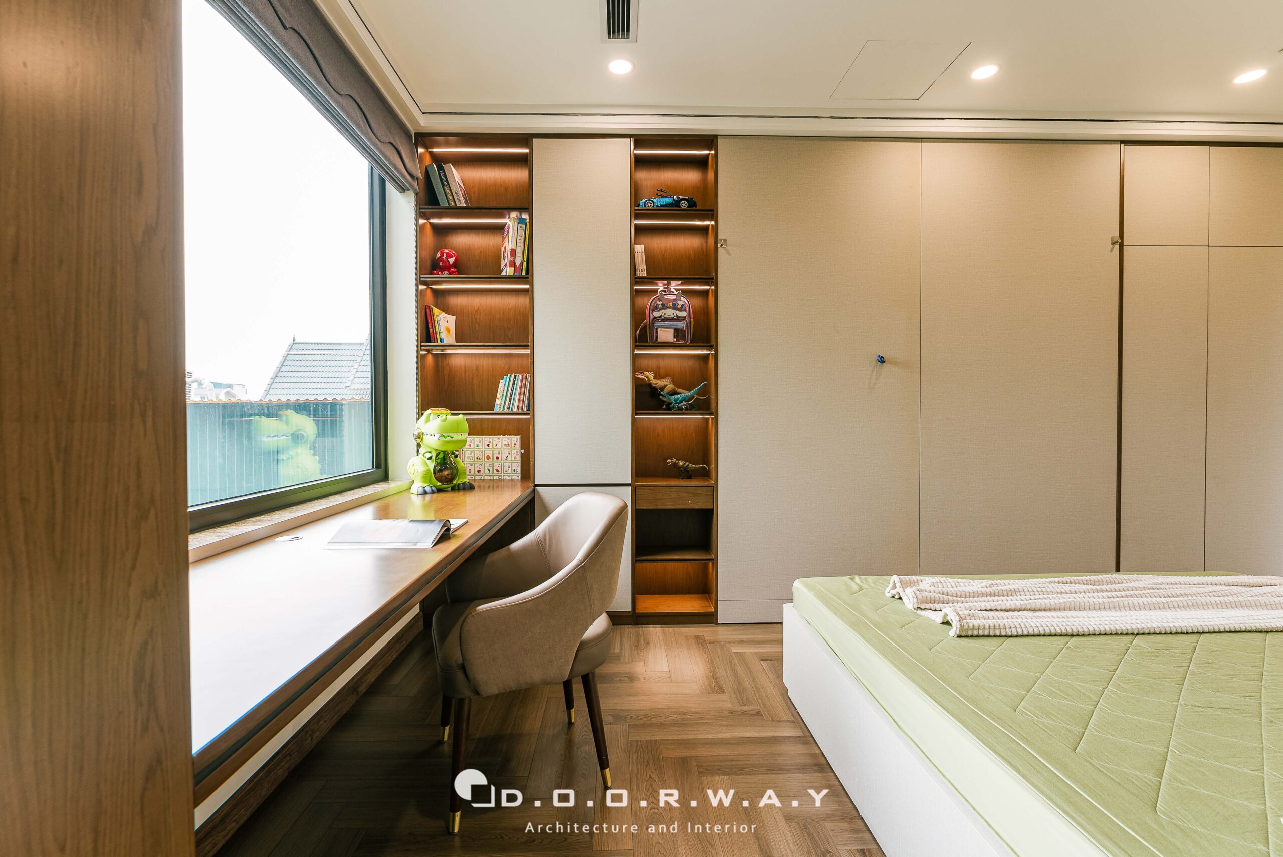 Phòng ngủ dành cho bé trai trong nội thất biệt thự Gia Lâm được thiết kế với định hướng sử dụng lâu dài, bởi vậy không đi theo lối mòn “trẻ con hóa” quá nhiều chi tiết mà thay vào đó là sự tinh tế, hiện đại và bền vững theo thời gian. Không gian nổi bật với hệ gỗ ấm áp kết hợp mảng tường sáng, tạo sự cân bằng giữa trẻ trung và chững chạc. Giường ngủ đơn giản, gọn gàng, đi kèm táp đầu giường tiện dụng.