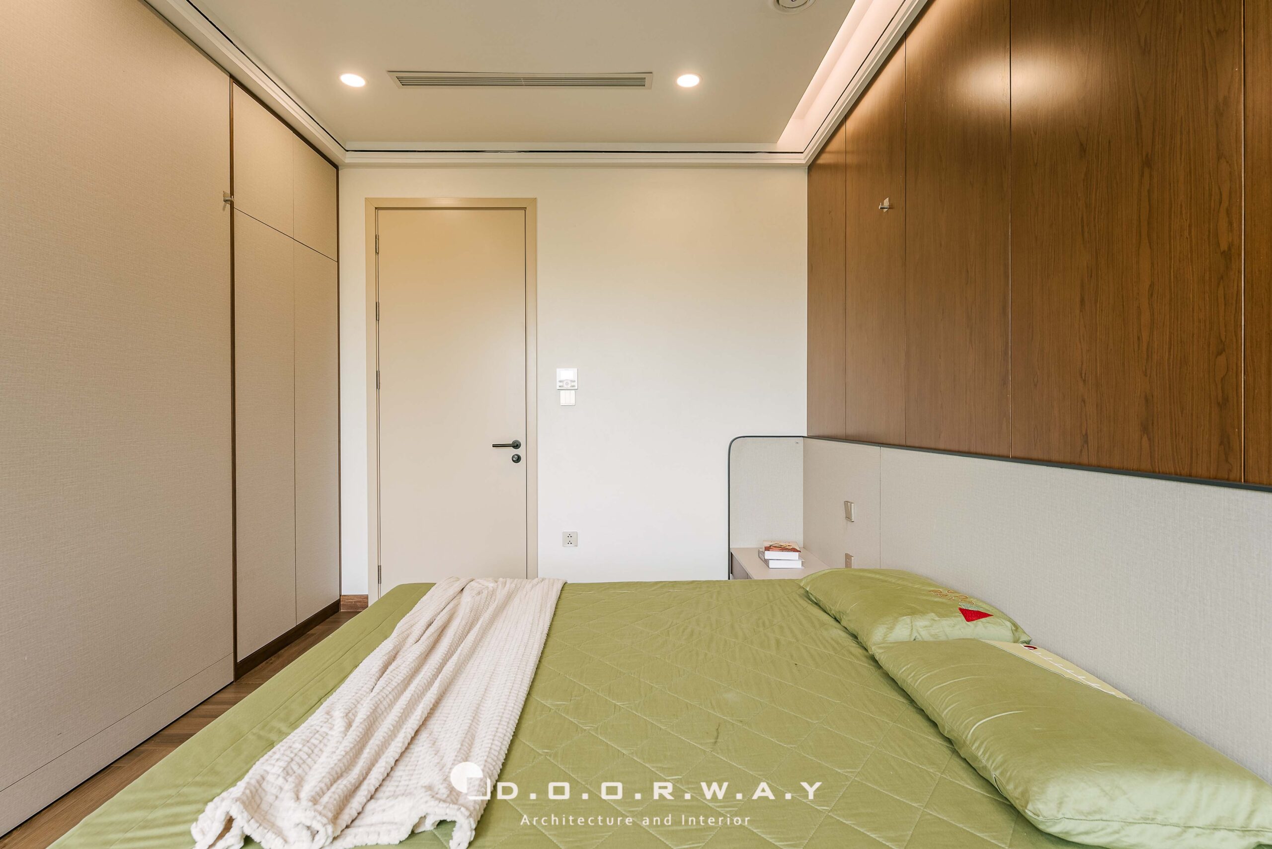 Hệ tủ quần áo âm tường trải dài, cửa phẳng với tay nắm kim loại tinh tế, vừa tiết kiệm diện tích vừa tạo sự đồng bộ cho không gian.