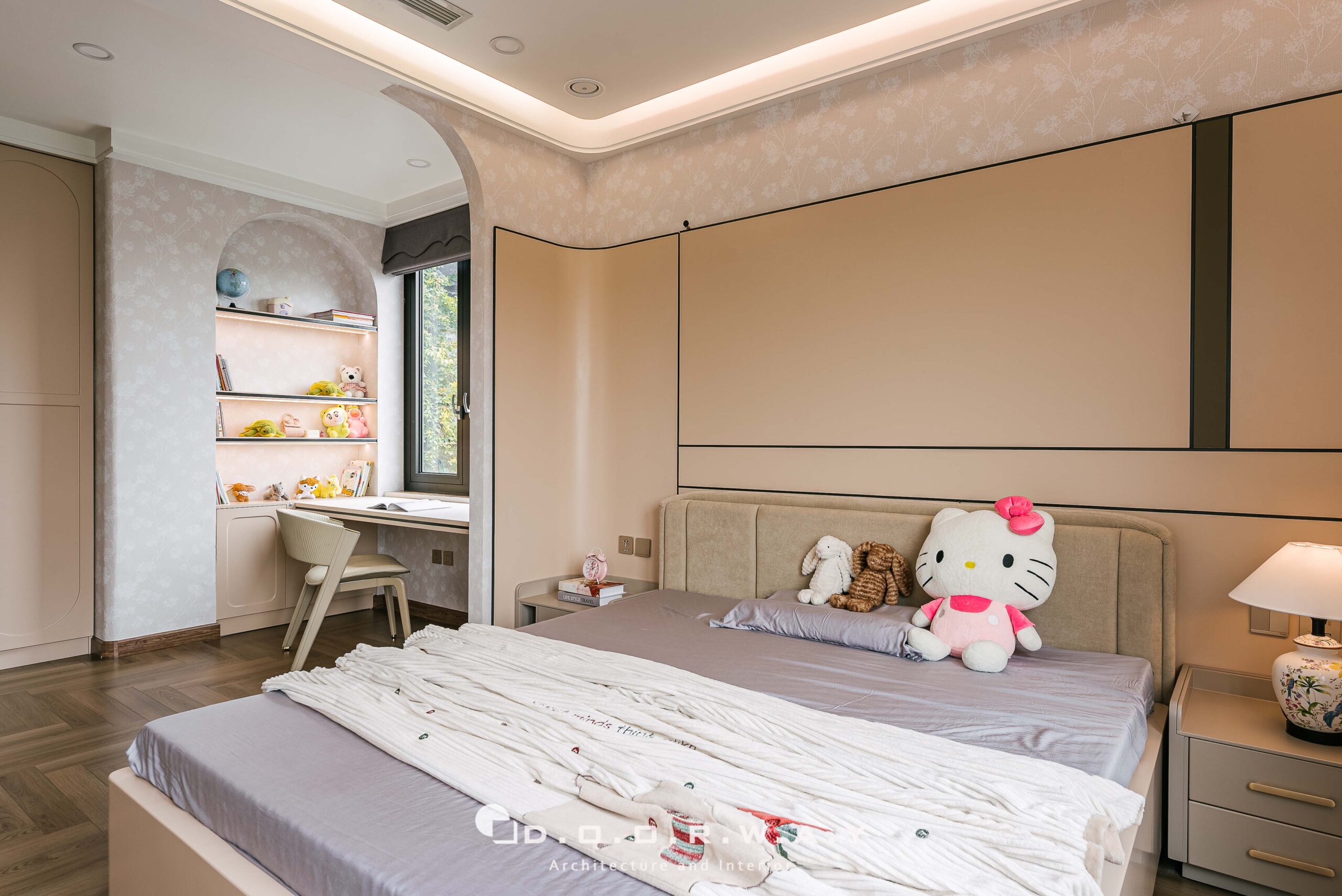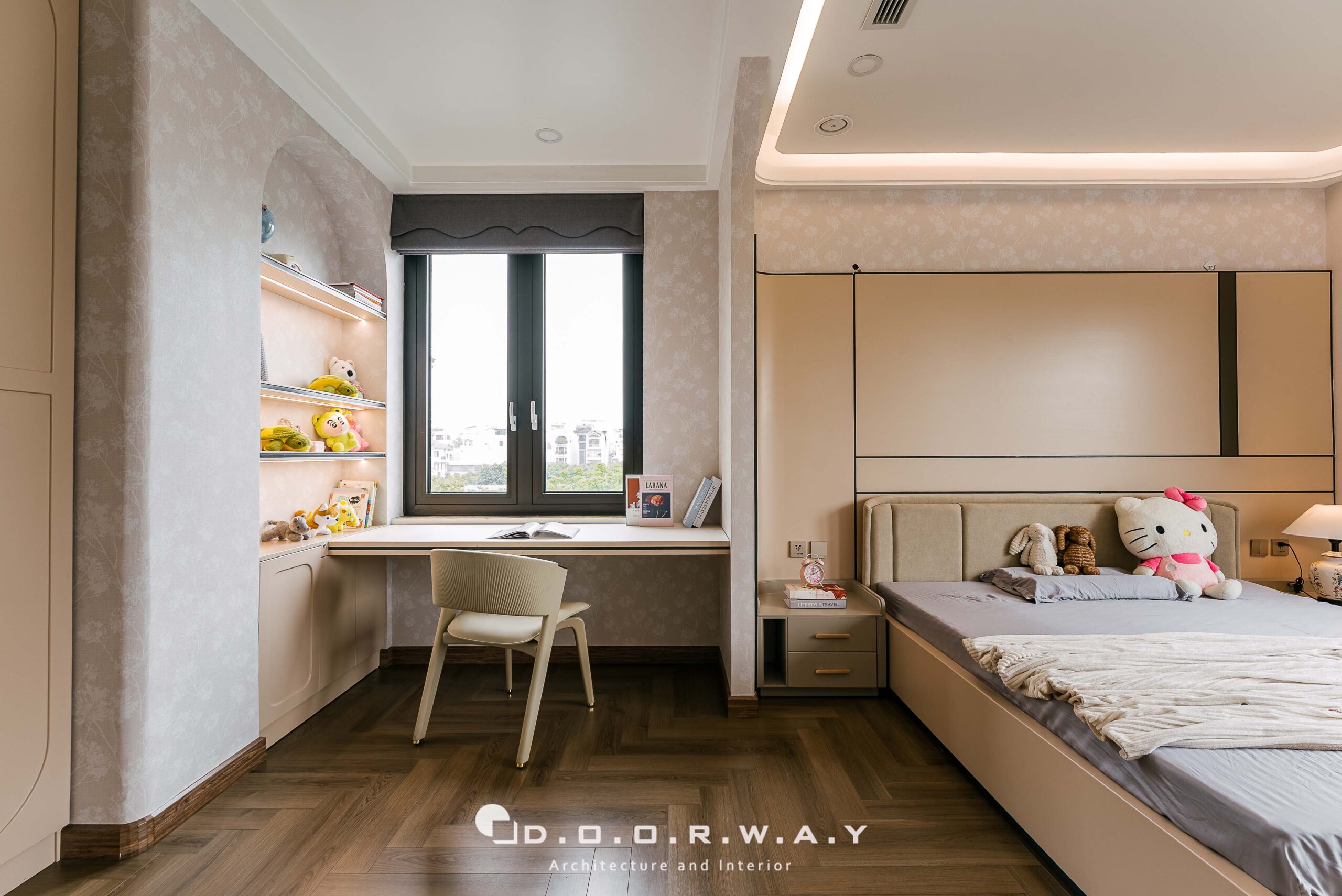 Tổng thể, phòng ngủ này không chỉ đáp ứng đầy đủ công năng cho sinh hoạt và học tập mà còn nuôi dưỡng cảm xúc, thẩm mỹ cho trẻ nhỏ – một không gian riêng tư vừa đáng yêu vừa thanh lịch trong tổng thể biệt thự.