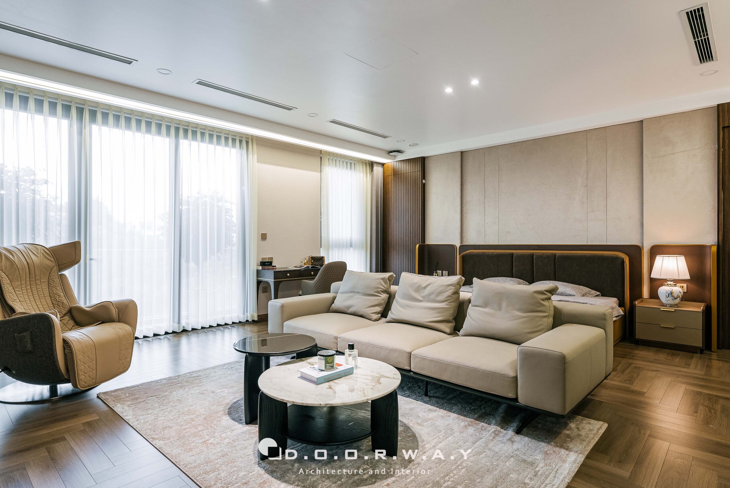 Phòng ngủ master trong nội thất biệt thự Gia Lâm là nơi hội tụ đầy đủ sự sang trọng, tinh tế và tiện nghi, mang đến trải nghiệm sống đẳng cấp cho chủ nhân căn phòng. Bước vào căn phòng, cảm giác đầu tiên là sự rộng mở và thoáng đãng, nhờ cách xử lý không gian khéo léo kết hợp cùng hệ cửa kính lớn đón trọn ánh sáng tự nhiên. Tâm điểm căn phòng là chiếc giường lớn với thiết kế đầu giường bọc nỉ nhung cao cấp, ôm trọn mảng vách ốp mềm mại phía sau. Hai bên là những mảng gỗ chạy dọc kết hợp tab đầu giường nhỏ gọn, vừa đảm bảo công năng vừa tạo bố cục cân xứng đầy thẩm mỹ, bên trên là vách ốp gỗ bề mặt lanimategiả vải sang trọng tinh tế. Ngay phía trước, bộ sofa da màu kem kết hợp bàn trà nhỏ, biến phòng ngủ không chỉ là chốn nghỉ ngơi mà còn như một “suite khách sạn” thu nhỏ, nơi gia chủ có thể thư giãn đọc sách, thưởng thức một tách trà hay xem một bộ phim yêu thích.