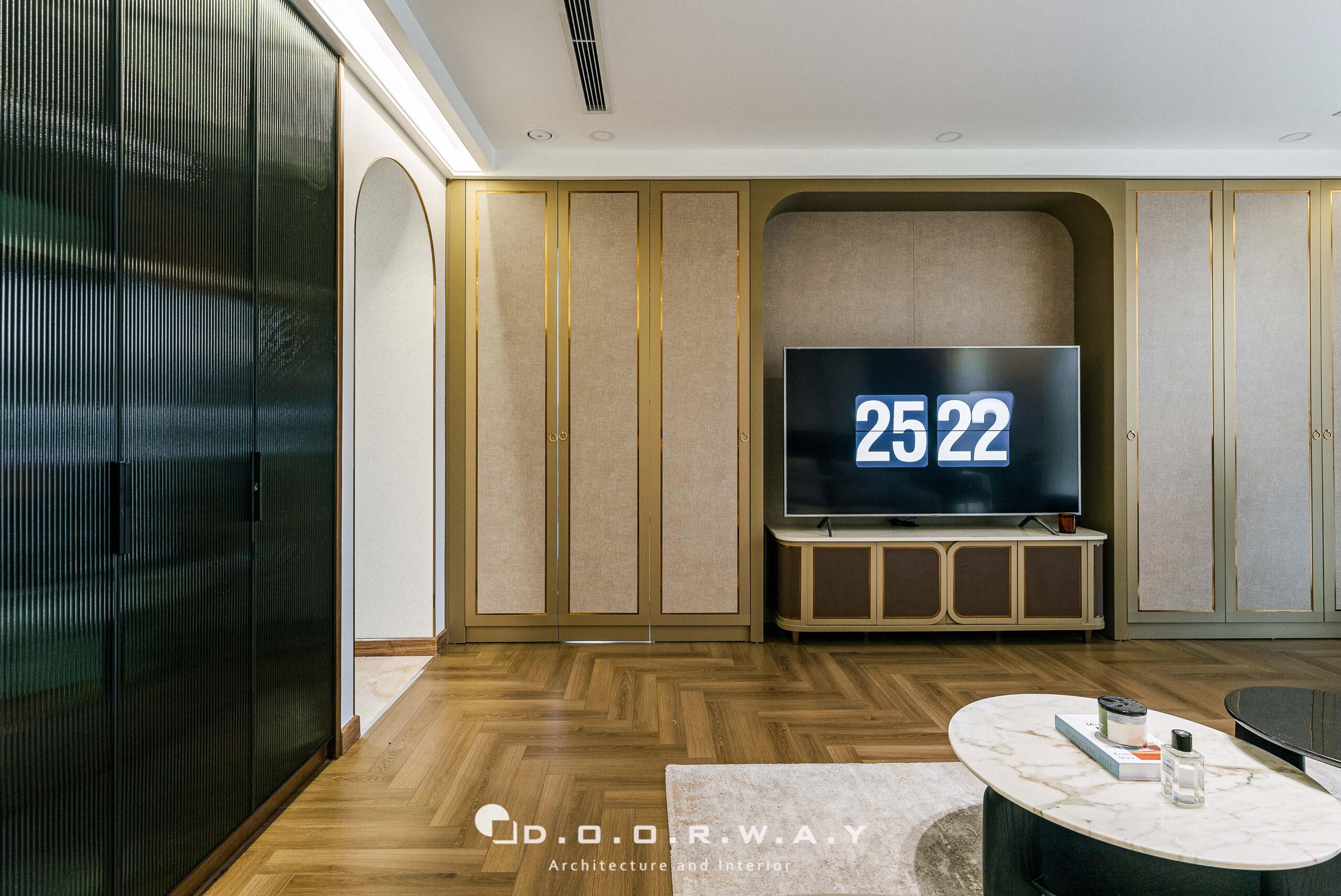 Đối diện là hệ vách tivi được thiết kế hiện đại, tinh gọn, hai bên khéo léo tích hợp tủ âm tường cao kịch trần. Đây vừa là giải pháp tối ưu lưu trữ, vừa tạo sự cân đối, liền mạch cho tổng thể không gian. Những đường nét phẳng, sắc gọn cùng màu sắc hài hòa giúp căn phòng giữ được vẻ sang trọng nhưng không hề nặng nề. Đằng sau hệ tủ liền mạch là hệ cửa dấu khuôn, tạo không một không gian đi ra khu ban công thư giãn bên ngoài