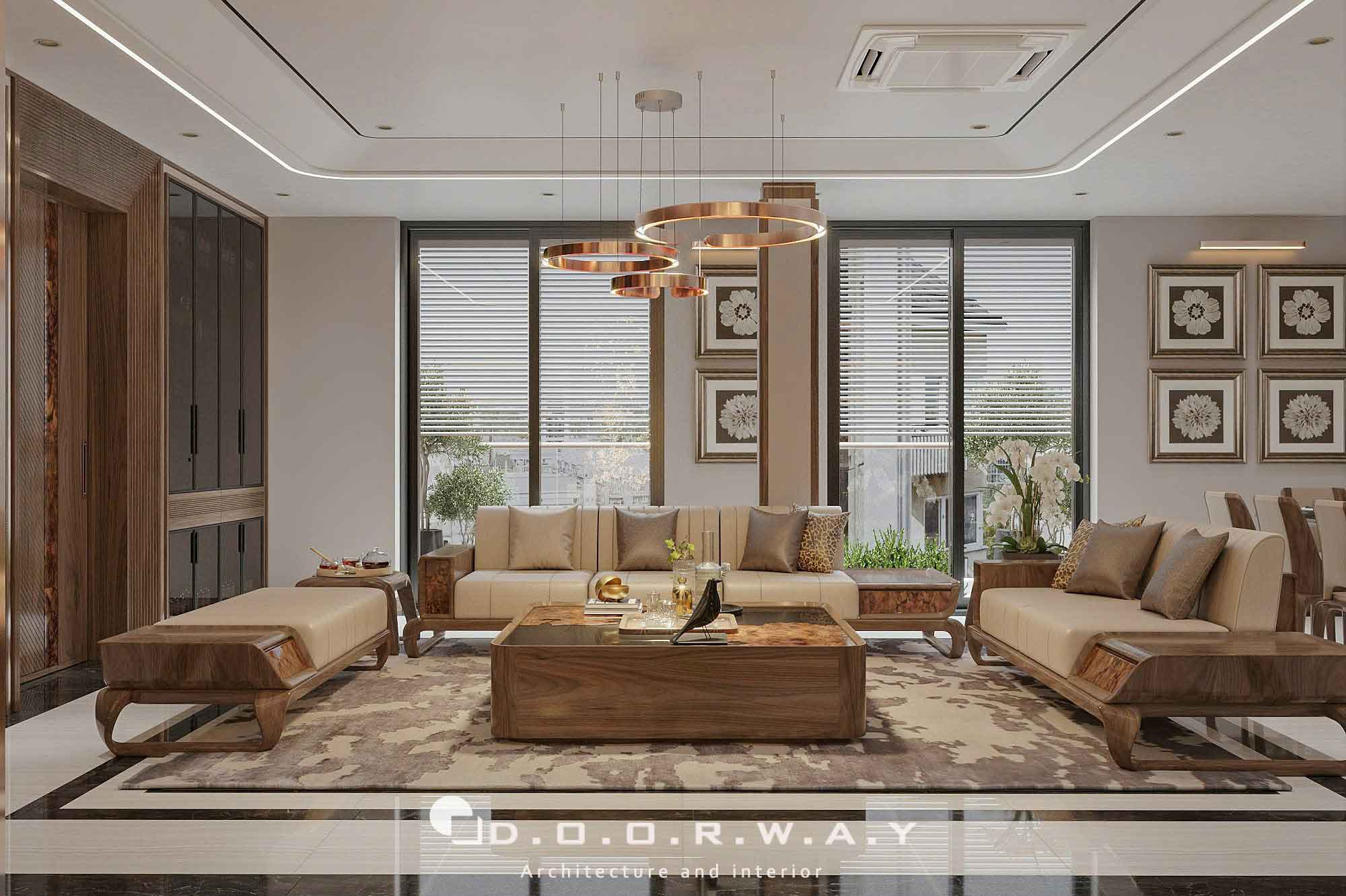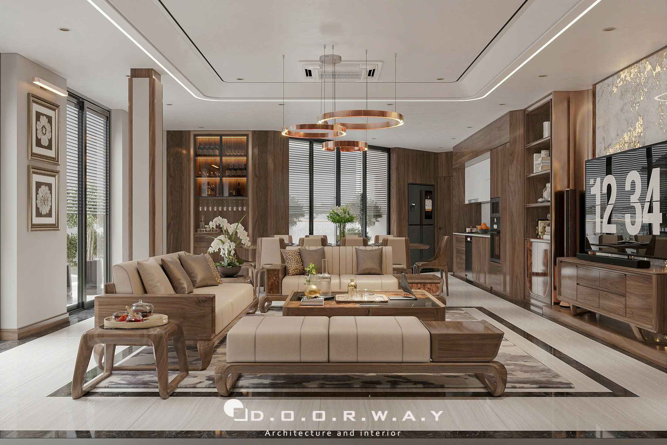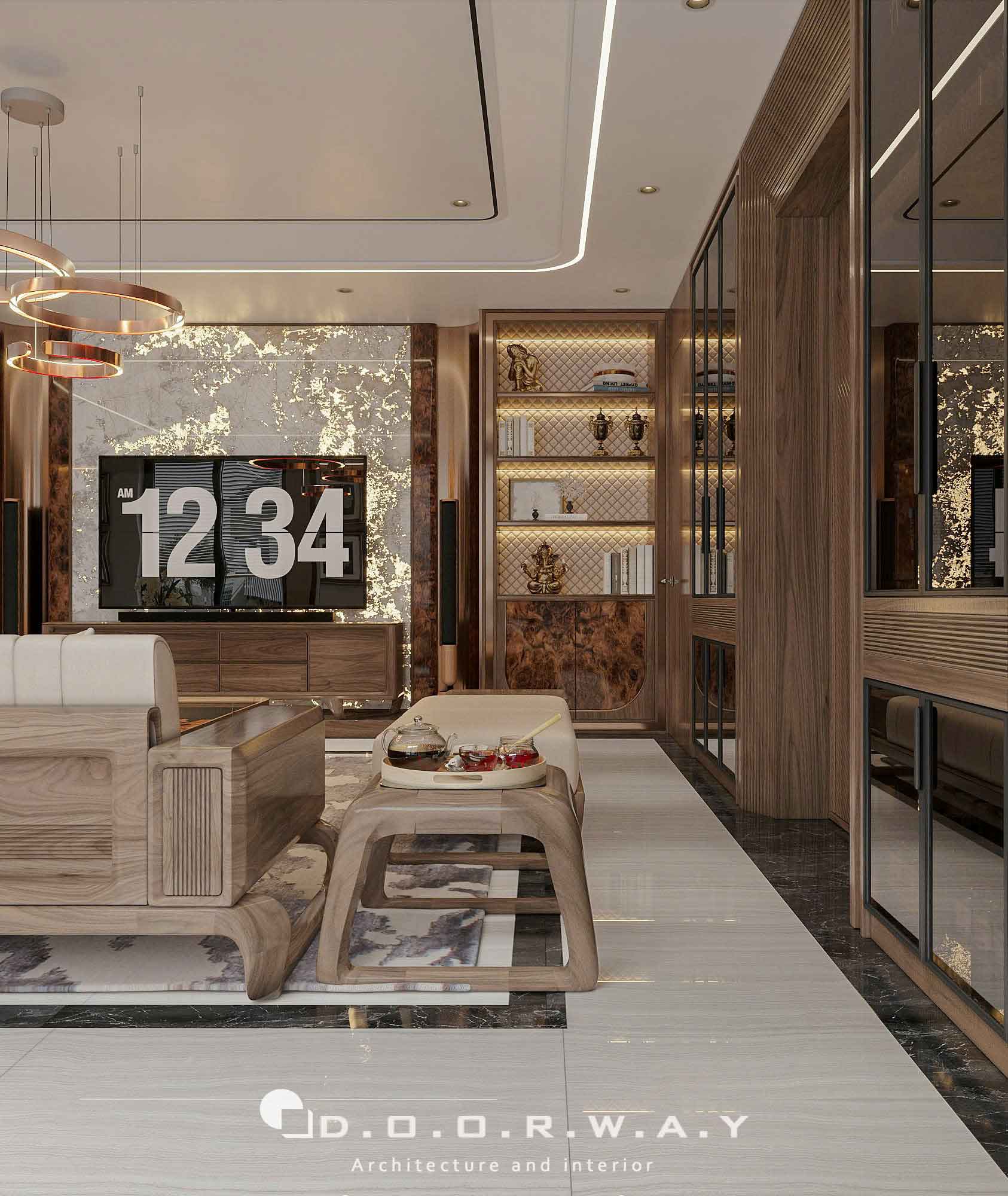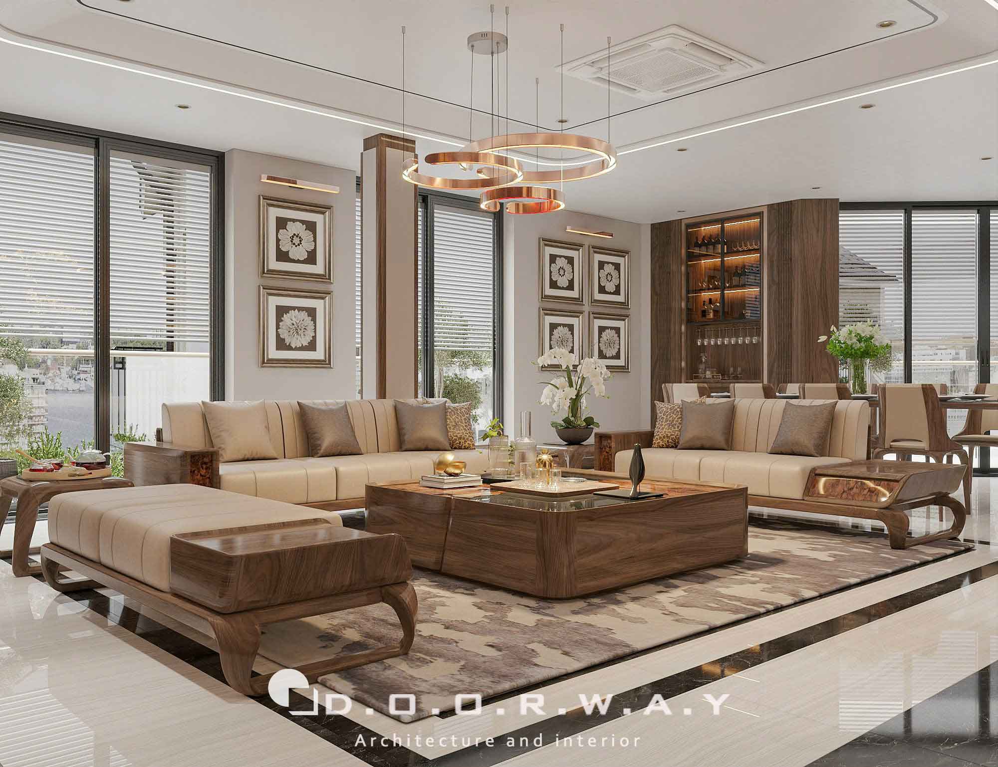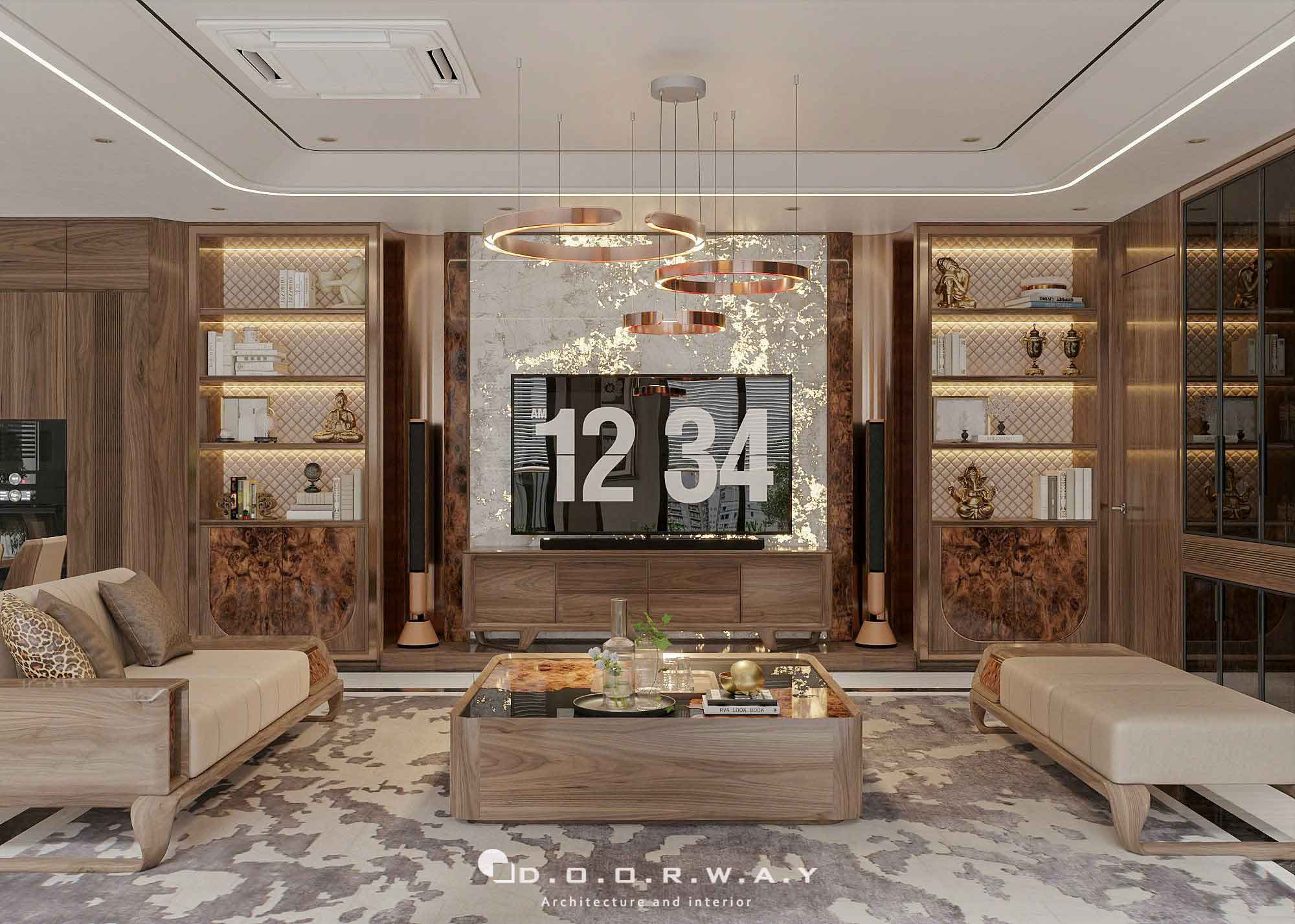 Phòng khách được xem là “trái tim” của toàn bộ căn nhà, nơi hội tụ đầy đủ yếu tố thẩm mỹ và công năng. Bộ sofa gỗ óc chó với thiết kế bo cong mềm mại không chỉ mang lại cảm giác thoải mái khi sử dụng mà còn thể hiện rõ nét sự tinh xảo trong từng chi tiết. Bàn trà trung tâm vuông vức, kết hợp mặt kính hiện đại, giúp tôn lên vẻ đẹp tự nhiên của vân gỗ. Điểm nhấn đặc biệt nằm ở hệ vách tivi ốp đá vân mây sang trọng, kết hợp ánh sáng hắt nhẹ tạo chiều sâu và sự cuốn hút cho không gian. Hai bên là hệ tủ trang trí âm tường được bố trí cân đối, vừa có giá trị thẩm mỹ, vừa gia tăng tiện ích sử dụng.