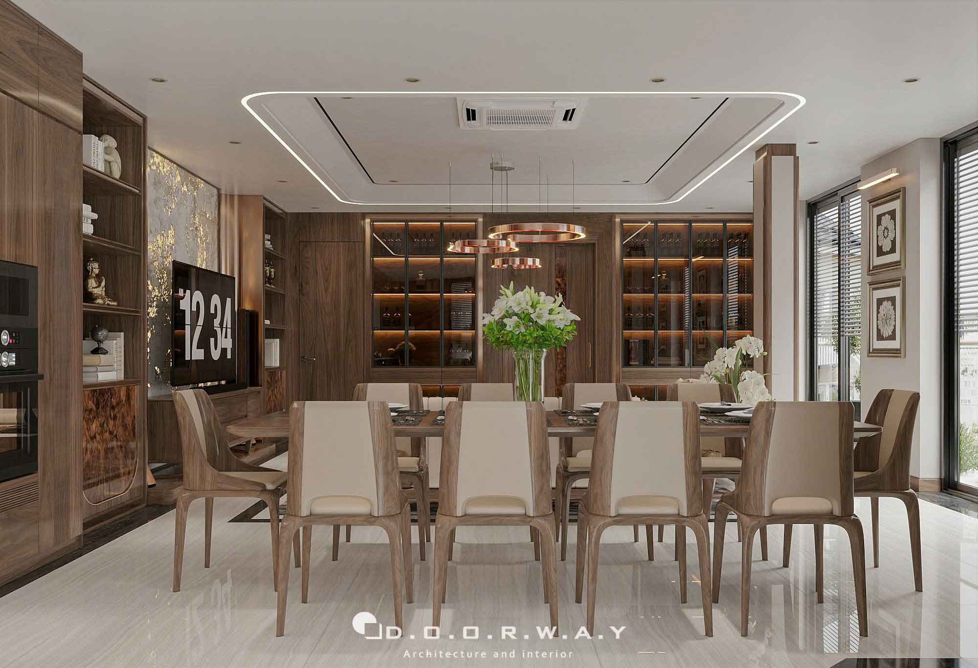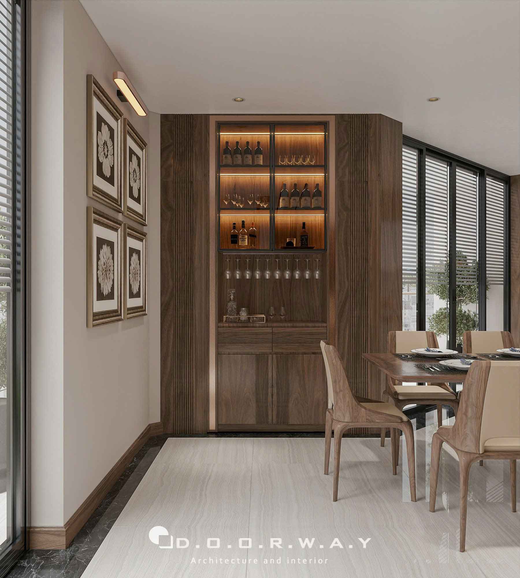 Một điểm nổi bật trong nội thất nhà phố gỗ óc chó chính là cách tổ chức không gian mở, liên thông giữa phòng khách – phòng ăn – bếp.Tiếp nối không gian phòng khách là khu vực bàn ăn được thiết kế liền mạch, mang lại cảm giác ấm cúng và gần gũi. Bộ bàn ăn gỗ óc chó với thiết kế chắc chắn, ghế bọc da cao cấp đồng bộ tạo nên sự hài hòa về tổng thể. Phía sau là hệ tủ rượu kết hợp kính và ánh sáng vàng dịu, không chỉ tăng tính sang trọng mà còn tạo chiều sâu cho không gian. Đây không đơn thuần là nơi dùng bữa, mà còn là nơi lưu giữ những khoảnh khắc sum họp, gắn kết giữa các thành viên trong gia đình.