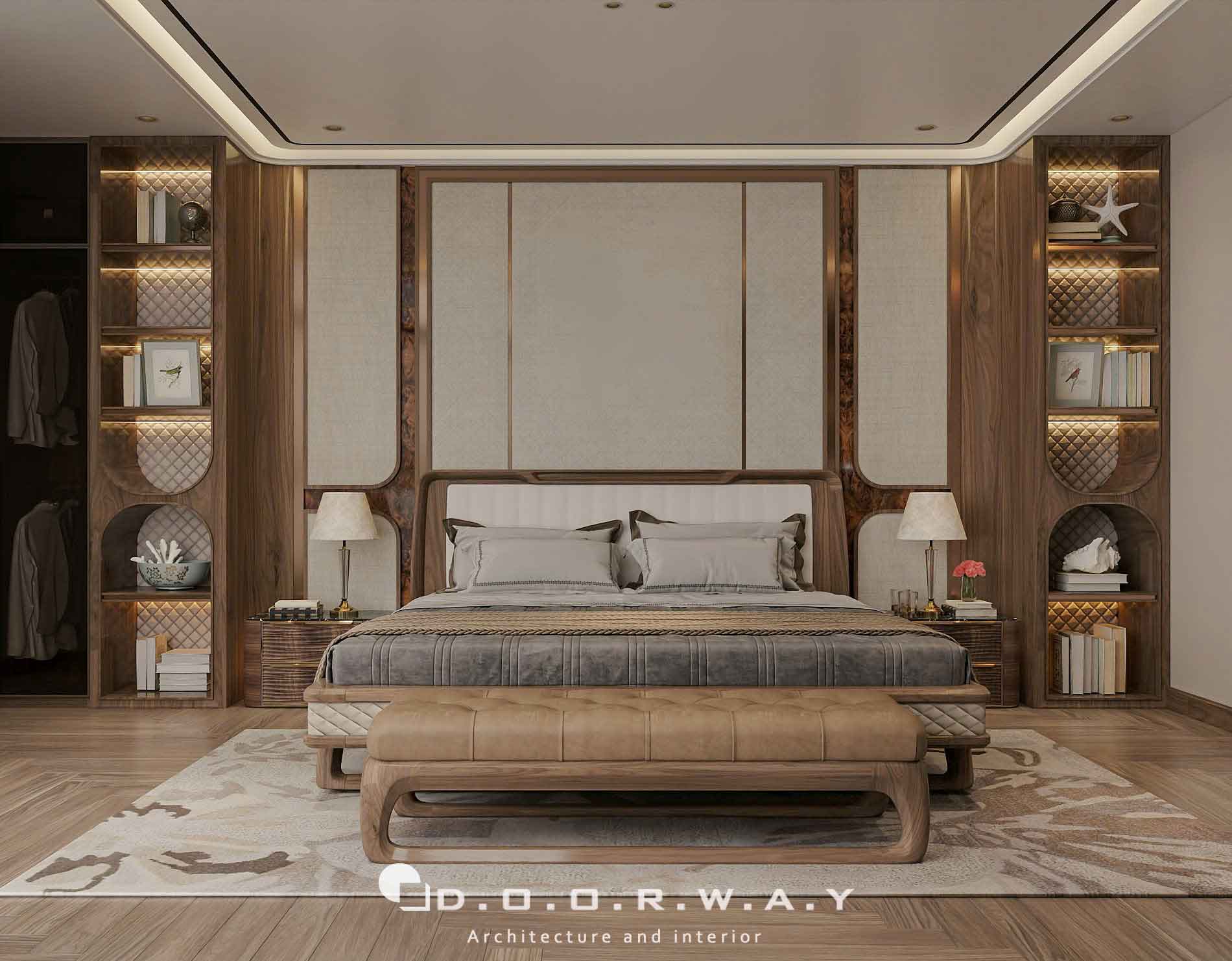 Không gian phòng ngủ trong dự án này thể hiện rõ nét tinh thần của nội thất nhà phố gỗ óc chó: sang trọng, ấm áp nhưng không hề nặng nề. Tông màu nâu trầm đặc trưng của gỗ kết hợp cùng ánh sáng vàng dịu nhẹ tạo nên cảm giác thư giãn tuyệt đối.Điểm nhấn nằm ở hệ vách đầu giường được thiết kế đối xứng, kết hợp các chi tiết bo cong mềm mại và vật liệu ốp cao cấp. Sự cân đối trong bố cục giúp không gian trở nên hài hòa, đồng thời nâng tầm thẩm mỹ tổng thể. Giường ngủ, tab đầu giường và băng ghế đều được đồng bộ về chất liệu, mang lại sự liền mạch và đẳng cấp.
