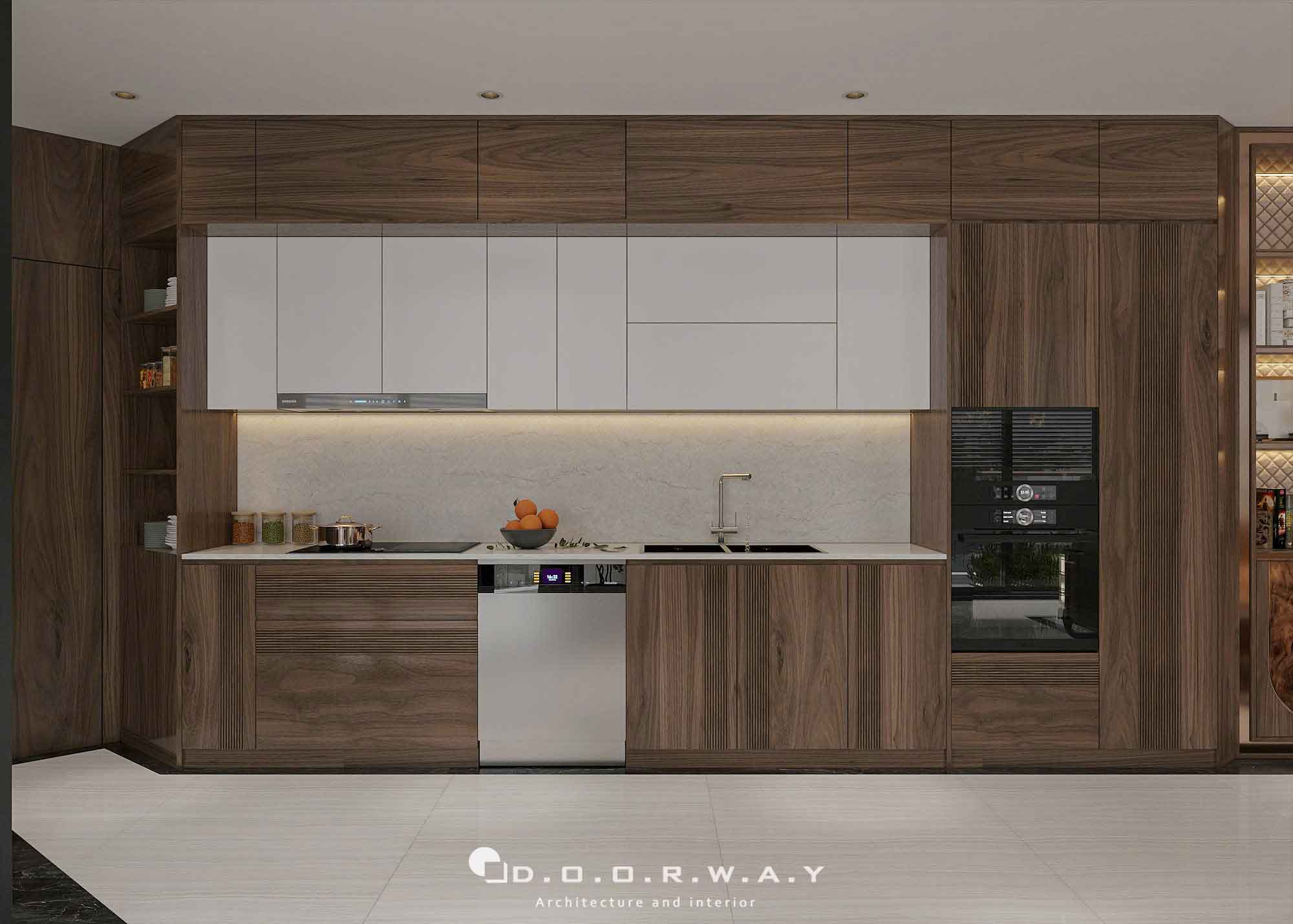 Không chỉ đẹp, khu bếp trong thiết kế nội thất nhà phố gỗ óc chó còn được tối ưu về công năng:Khu bếp được xử lý theo phong cách tối giản nhưng vẫn đảm bảo đầy đủ tiện nghi. Hệ tủ bếp trên dưới sử dụng gỗ óc chó kết hợp cánh trắng hiện đại, tạo nên sự cân bằng giữa vẻ ấm áp và cảm giác sạch sẽ, tinh gọn. Mặt bếp sáng màu cùng hệ thống thiết bị âm tường được bố trí khoa học giúp tối ưu trải nghiệm sử dụng. Ánh sáng led dưới tủ không chỉ hỗ trợ chiếu sáng mà còn góp phần tăng tính thẩm mỹ, khiến khu bếp trở nên sinh động và hiện đại hơn.