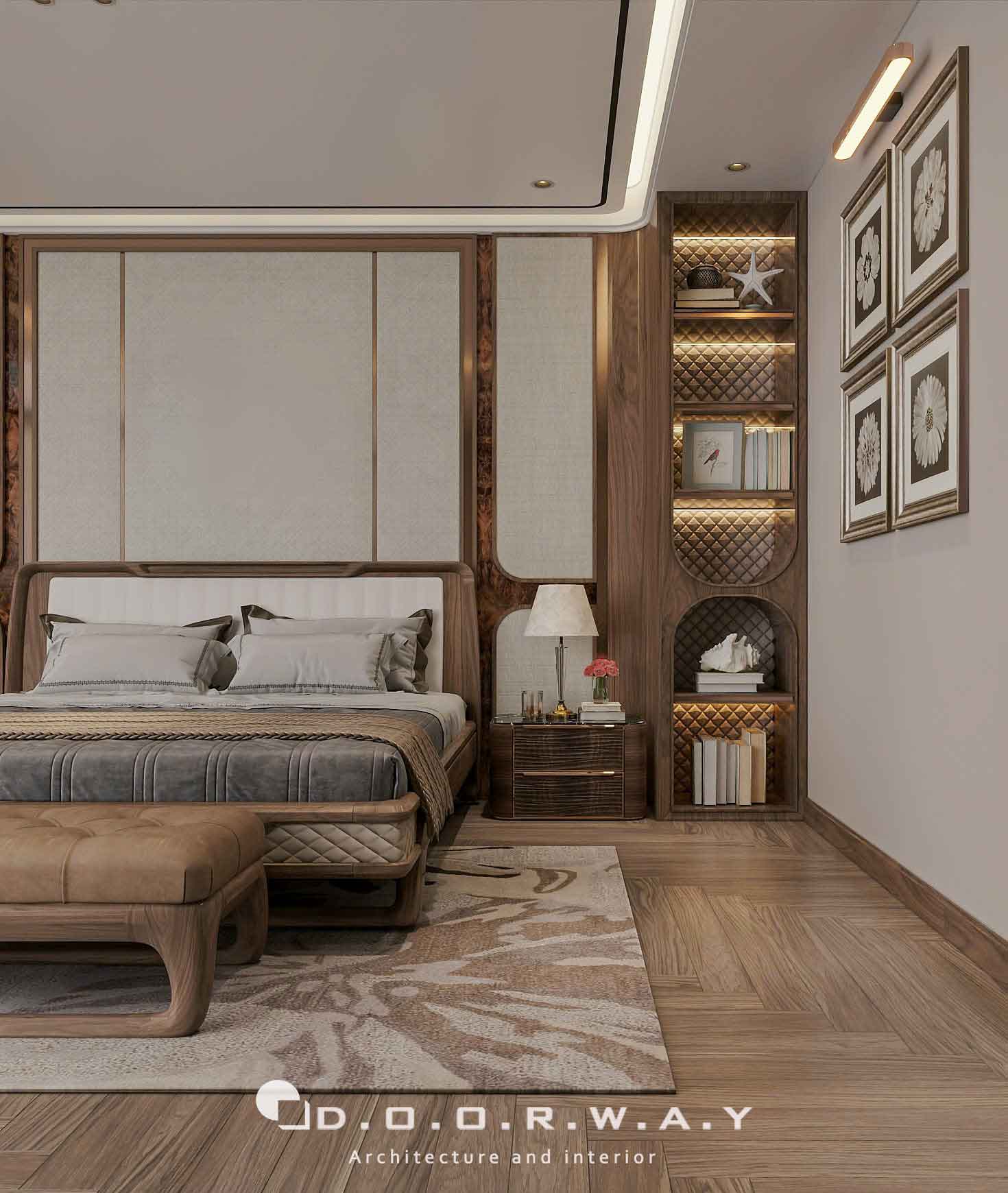 Xuyên suốt không gian là sự phối hợp khéo léo giữa gam màu nâu trầm của gỗ óc chó, sắc trung tính của nội thất và ánh sáng vàng ấm áp từ hệ đèn trang trí. Tất cả hòa quyện, tạo nên một tổng thể cân đối, sang trọng nhưng không hề nặng nề. Chính sự tiết chế trong chi tiết, cùng cách xử lý vật liệu tinh tế đã giúp căn phòng đạt đến độ “chín” trong thiết kế – nơi mà mỗi góc nhìn đều mang lại cảm xúc dễ chịu và thư thái.