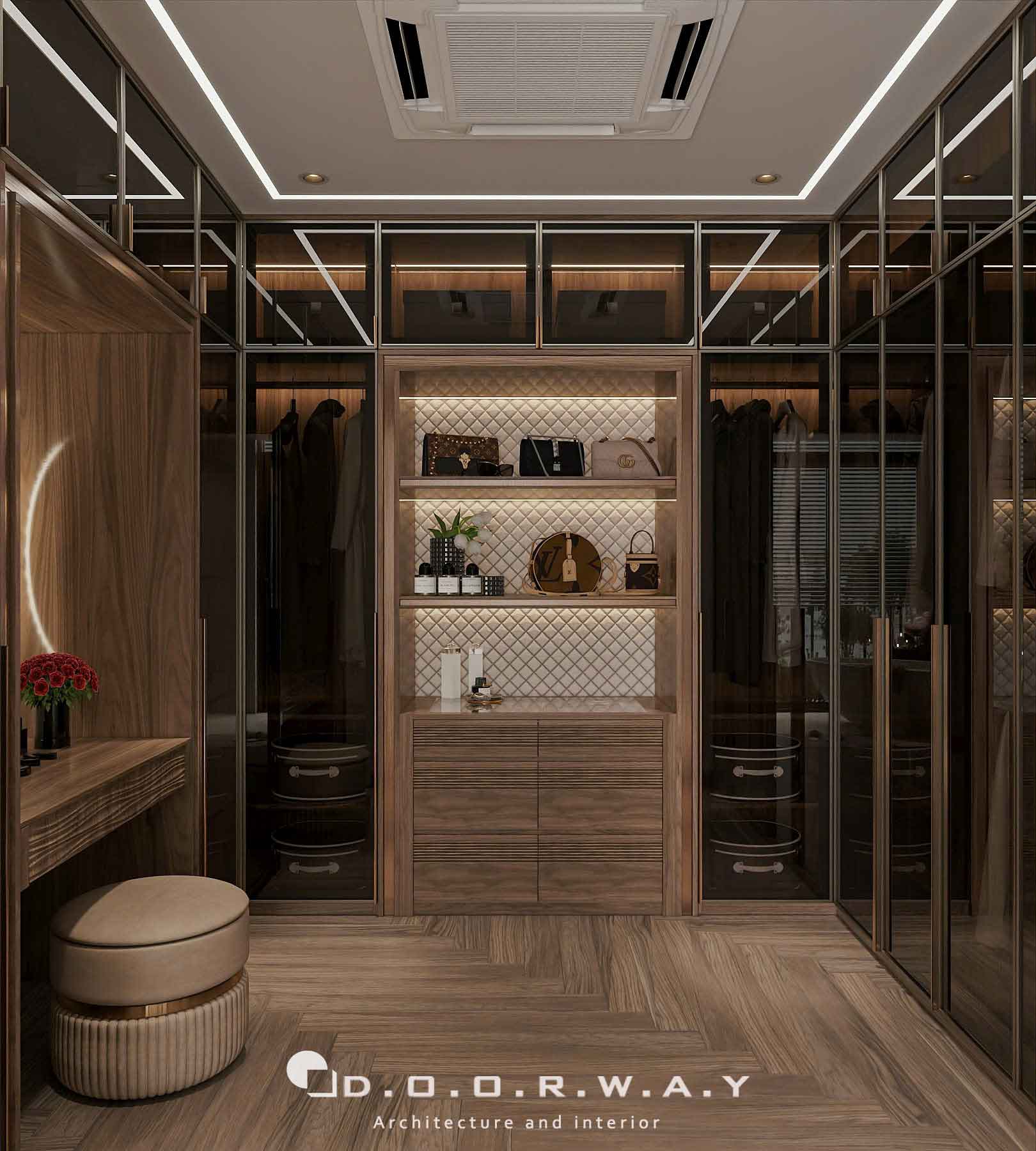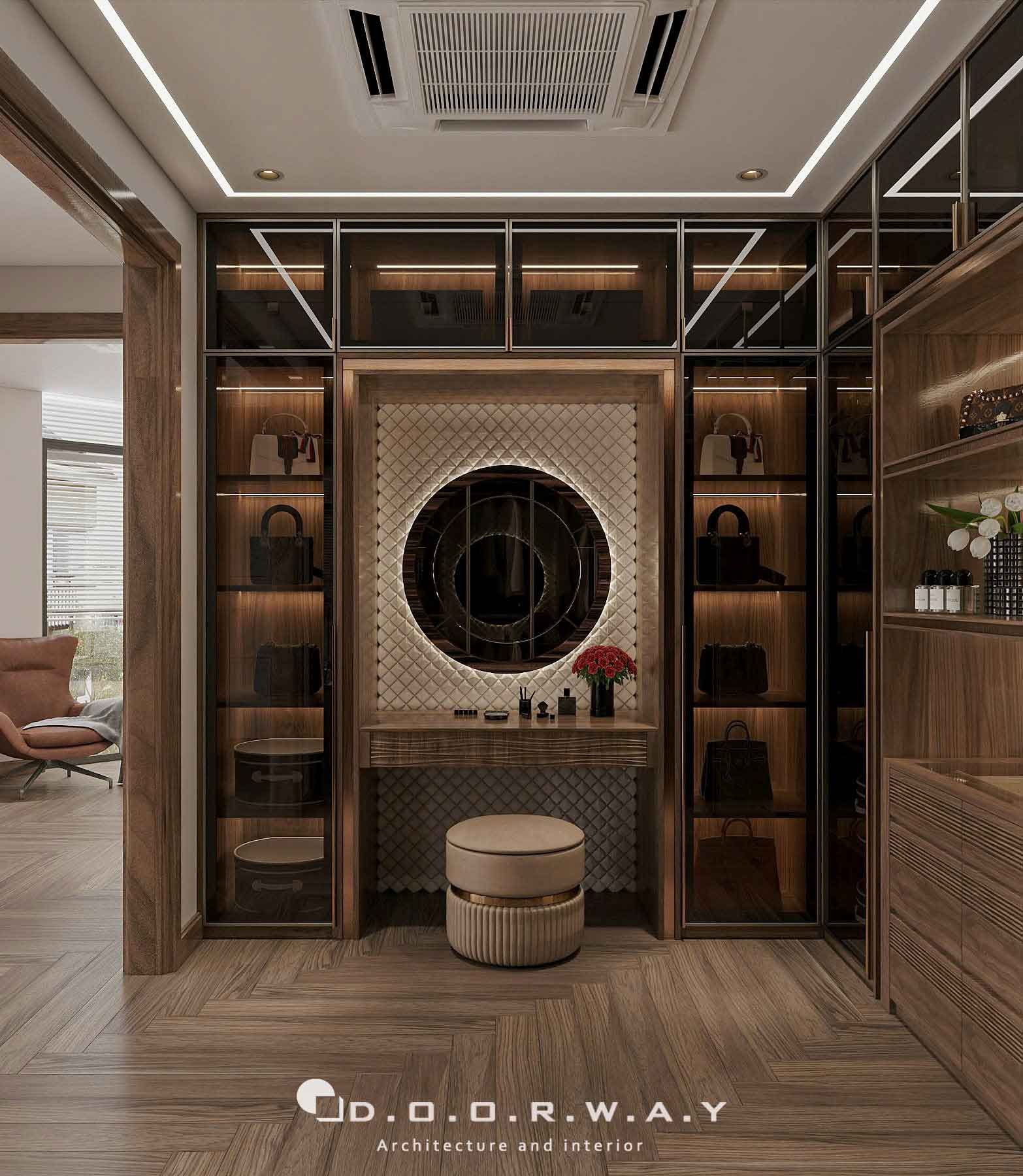 Khu vực thay đồ được thiết kế như một không gian riêng biệt, mang đậm hơi hướng luxury. Hệ tủ kính khung kim loại kết hợp gỗ óc chó không chỉ giúp trưng bày đồ đạc một cách khoa học mà còn tạo hiệu ứng thị giác sang trọng. Ánh sáng LED được bố trí khéo léo bên trong từng khoang tủ, giúp tôn lên màu sắc và chất liệu của sản phẩm. Trung tâm phòng là bàn trang điểm kết hợp gương tròn – một chi tiết vừa mềm mại vừa tạo điểm nhấn nghệ thuật, giúp không gian trở nên cuốn hút hơn.