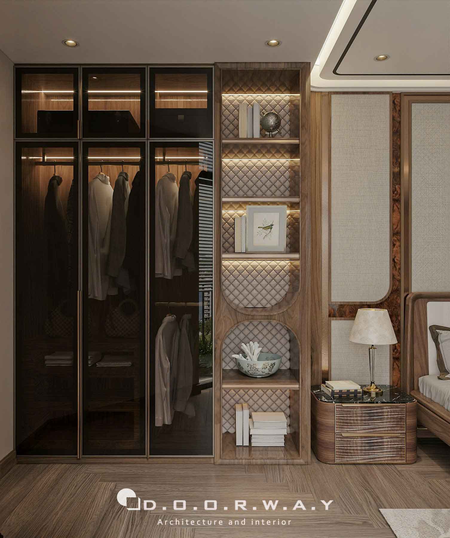 Không chỉ đẹp, nội thất trong thiết kế này còn được tính toán kỹ lưỡng về công năng. Hệ tủ được phân chia rõ ràng giữa khu treo đồ, ngăn kéo và khu trưng bày phụ kiện, giúp tối ưu hóa trải nghiệm sử dụng. Cửa kính trong suốt kết hợp ánh sáng giúp gia chủ dễ dàng quan sát và lựa chọn trang phục, đồng thời tạo cảm giác không gian rộng rãi hơn so với thực tế. Đây là giải pháp lý tưởng cho nhà phố – nơi diện tích cần được tận dụng tối đa nhưng vẫn phải đảm bảo tính thẩm mỹ.
