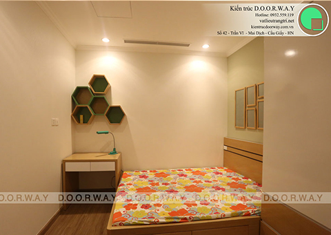Phòng ngủ 01 sau khi hoàn thiện các đồ nội thất gồm giường, tủ quần áo, bàn đọc, kệ trang trí treo tường hình tổ ong và bộ khung tranh nghệ thuật. Với diện tích vỏn vẹn 15m2, việc bài trí đồ đạc cũng cần có sự căn chỉnh hợp lý giúp không gian phòng được tận dụng một cách tối đa.