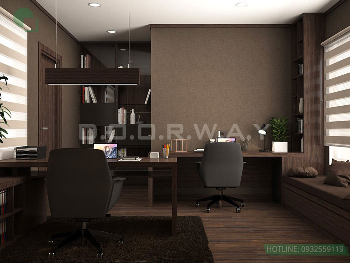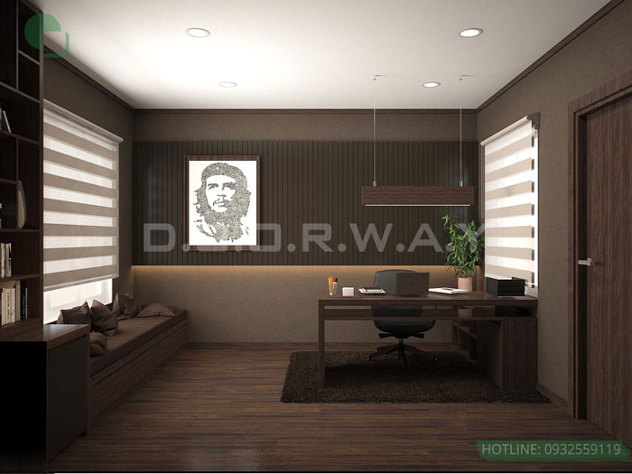 Phòng làm việc được người thiết kế chọn màu nâu trầm tạo cho gia chủ không gian yên tĩnh suy nghĩ, sử dụng đèn treo cho là sự sáng tạo đột phá mang đến ánh sáng vừa đủ cho nơi làm việc.