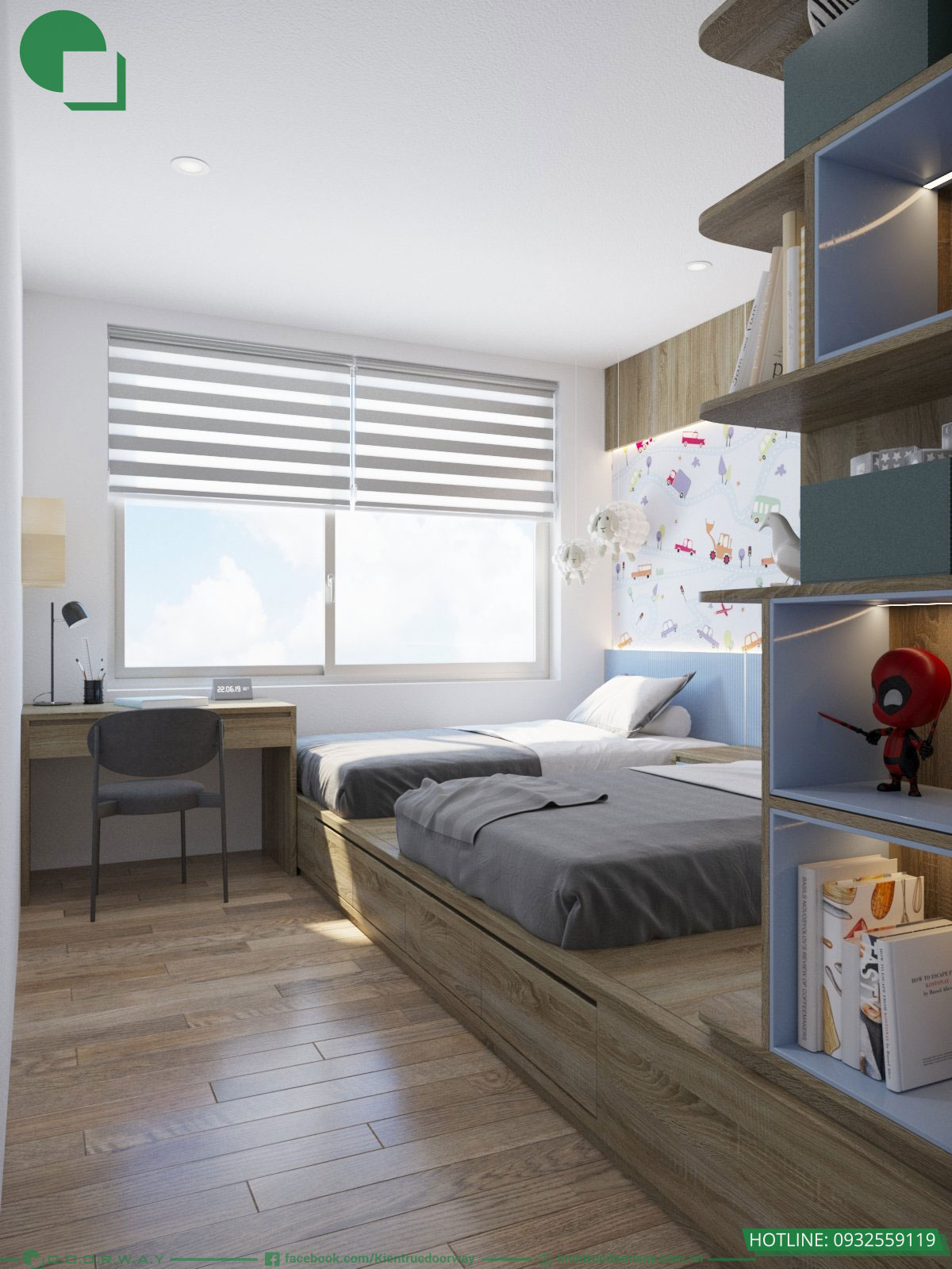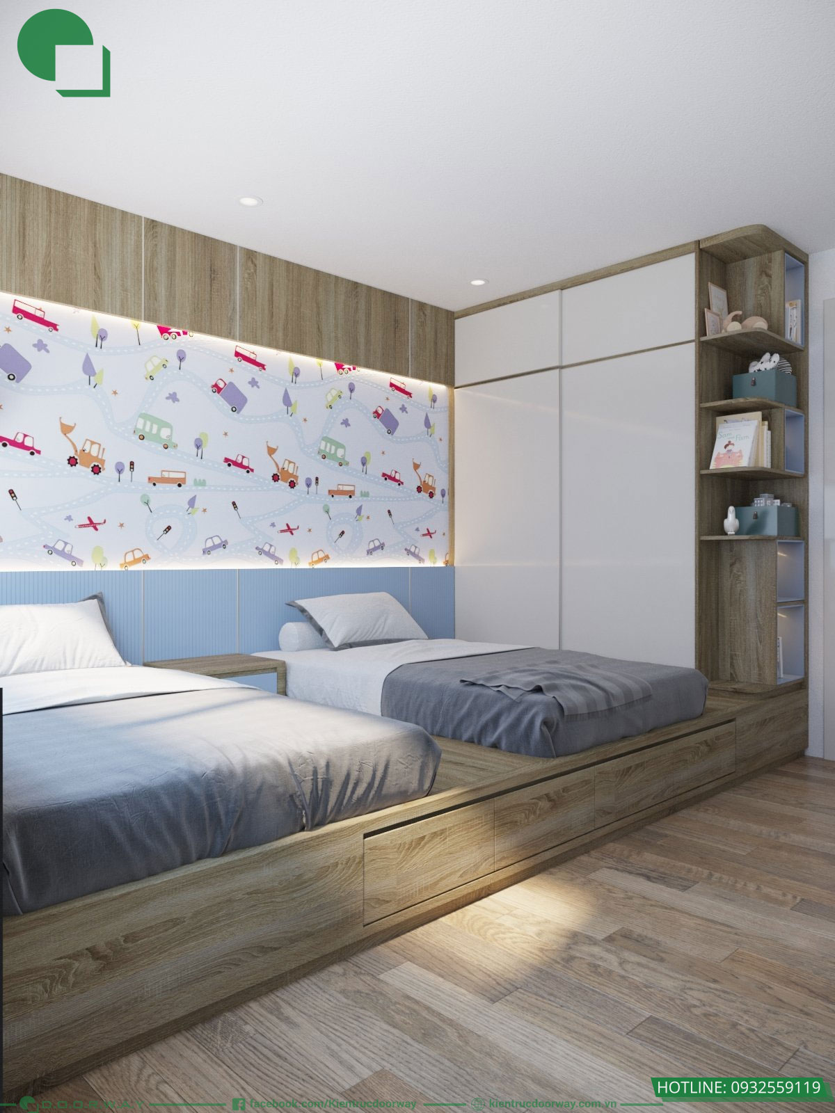 Phòng ngủ dành cho 2 bé được bày trí một cách thông minh và mang lại cảm giác thoáng đãng mà không kém phần tiện nghi. Với lối thiêt kế bậu giường gỗ có các ngăn kéo đựng đồ ở dưới và được bố trí 2 chiếc giường ở trên cho 2 con cùng với tủ quần áo kết hợp kệ đề đồ trang trí với thiết kế của lùa tối ưu không gian hiệu quả