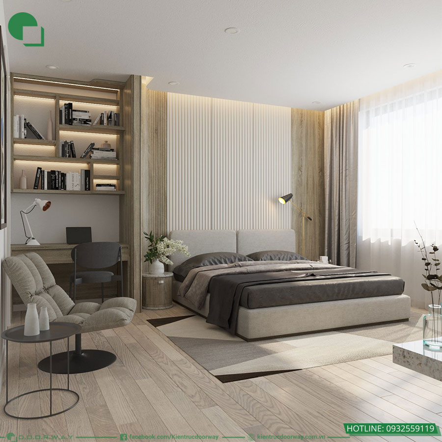 Phòng ngủ Master với diện tích rộng được bố trí không gian vô cùng tiện nghi và thú vị từ khu vực tủ quần áo, thay đồ, góc đọc sách, bàn tràng điểm và không gian phòng tắm