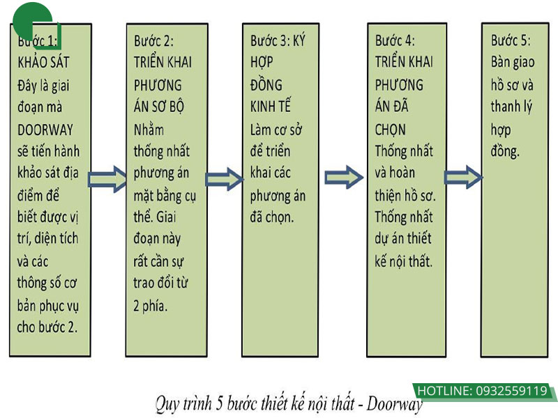 Khi lựa chọn đơn vị thiết kế và thi công nội thất Doorway, khách hàng sẽ được làm việc với 5 quy trình: khảo sát, triển khai phương án sơ bộ, ký hợp đồng, triển khai phương án lựa chọn; bàn giao hồ sơ và thanh lý hợp đồng. Từ khảo sát lên thiết kế sơ bộ cho đến thống nhất phương án lựa chọn để thiết kế và thi công đều được đội ngũ Doorway hoàn thiện chỉn chu và thống nhất giữa hai bên