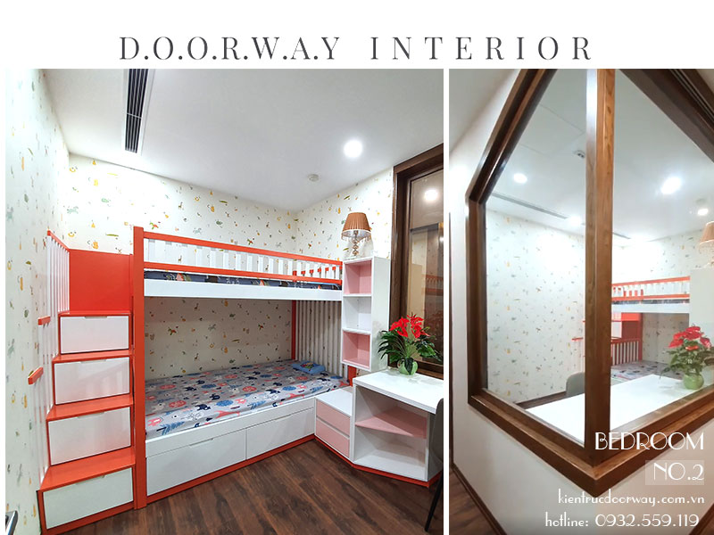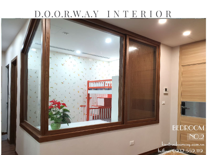 Điểm nhấn ấn tượng nhất của căn hộ chính là lối thiết kế độc đáo giữa phòng ngủ trẻ em và phòng khách. Với diện tích khá nhỏ, căn phòng được gia chủ mong muốn là nơi nghỉ ngơi, vui chơi của các cháu khi về. Kiến trúc sư đã bố trí ô cửa kính vuông mở ra một không gian rộng rãi, thoáng đãng và gắn kết các thành viên với nhau